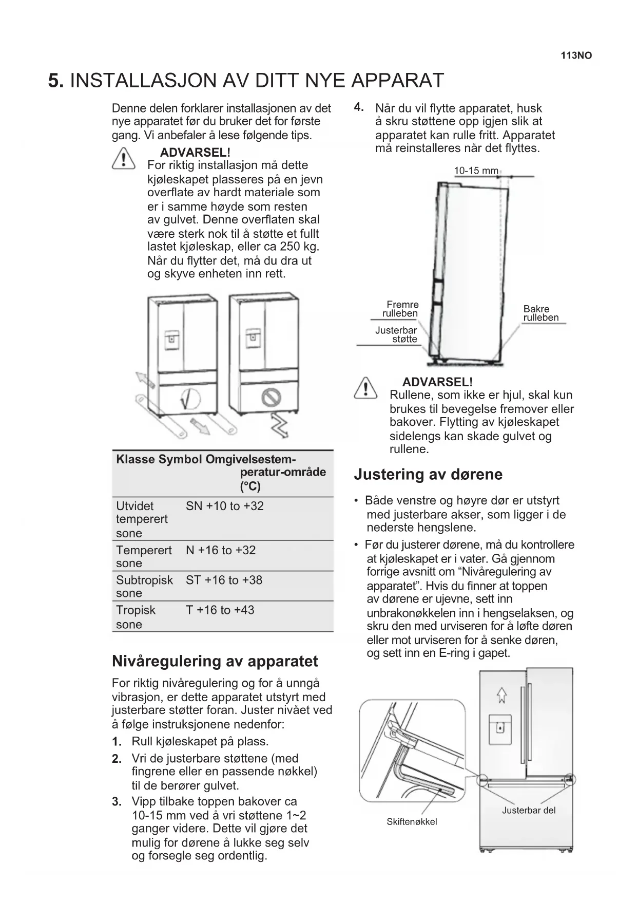 Denne delen forklarer installasjonen av det nye apparatet før du bruker det for første gang. Vi anbefaler å lese følgende tips. ADVARSEL! For riktig installasjon må dette kjøleskapet plasseres på en jevn overateavhardtmaterialesom er i samme høyde som resten avgulvet.Denneoveratenskal væresterknoktilåstøtteetfullt lastet kjøleskap, eller ca 250 kg. Nårduytterdet,mådudraut og skyve enheten inn rett. Klasse Symbol Omgivelsestem- peratur-område (°C) Utvidet temperert sone SN +10 to +32 Temperert sone N +16 to +32 Subtropisk sone ST +16 to +38 Tropisk sone T +16 to +43 Nivåregulering av apparatet For riktig nivåregulering og for å unngå vibrasjon, er dette apparatet utstyrt med justerbare støtter foran. Juster nivået ved å følge instruksjonene nedenfor: