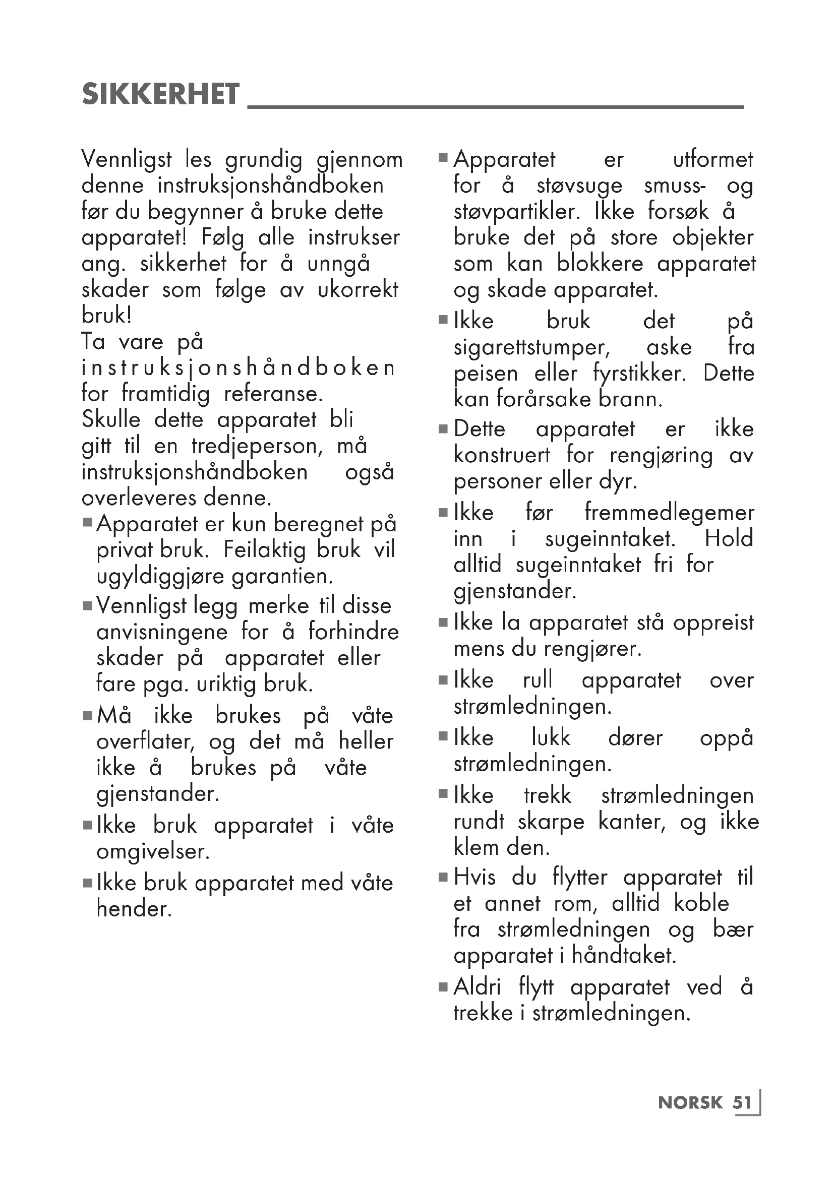 Aldri flytt apparatet ved å trekke i strømledningen.52 NORSK