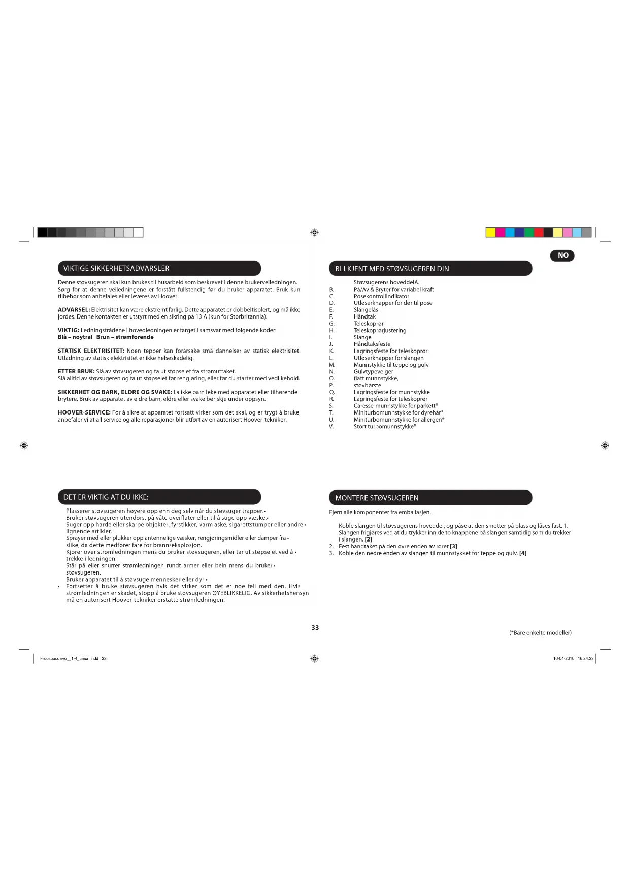 Kvalitet og miljø Kvalitet Hoovers fabrikker har blitt uavhengig kvalitetsvurdert. Våre produkter produseres ved å bruke et kvalitetssystem som er i samsvar med ISO 9001. Miljøet: Dette apparatet er merket i henhold til EU-direktiv 2002/96/EF om kassering av elektrisk og elektronisk utstyr (WEEE-direktivet). Gjennom å sikre at dette produktet avhendes på riktig måte, bidrar du til å forhindre mulige negative følger for miljø og menneskelig helse som vil kunne oppstå dersom produktet avhendes på feilaktig måte. Symbolet på produktet angir at dette produktet ikke kan behandles som husholdingsavfall. I stedet skal det overleveres til egnede kildesorteringsanlegg for resirkulering av elektrisk og elektronisk utstyr. Avhending må utføres i samsvar med lokale miljøbestemmelser for avfallshåndtering. For mer informasjon om behandling, gjenvinning og resirkulering av dette produktet, ta kontakt med den kommunale etaten for avfallshåndtering eller butikken der du kjøpte produktet. Din garanti Garantibetingelsene for dette apparatet er som denert av vår representant i det landet der det ble solgt. Detaljer vedrørende disse betingelsene fås fra forhandleren der apparatet ble kjøpt. Salgskvitteringen må fremvises ved fremsetting av krav under betingelsene i denne garantien.. Kan endres uten forvarsel. FreespaceEvo__1-4_union.indd 36 16-04-2010 16:24:3337
