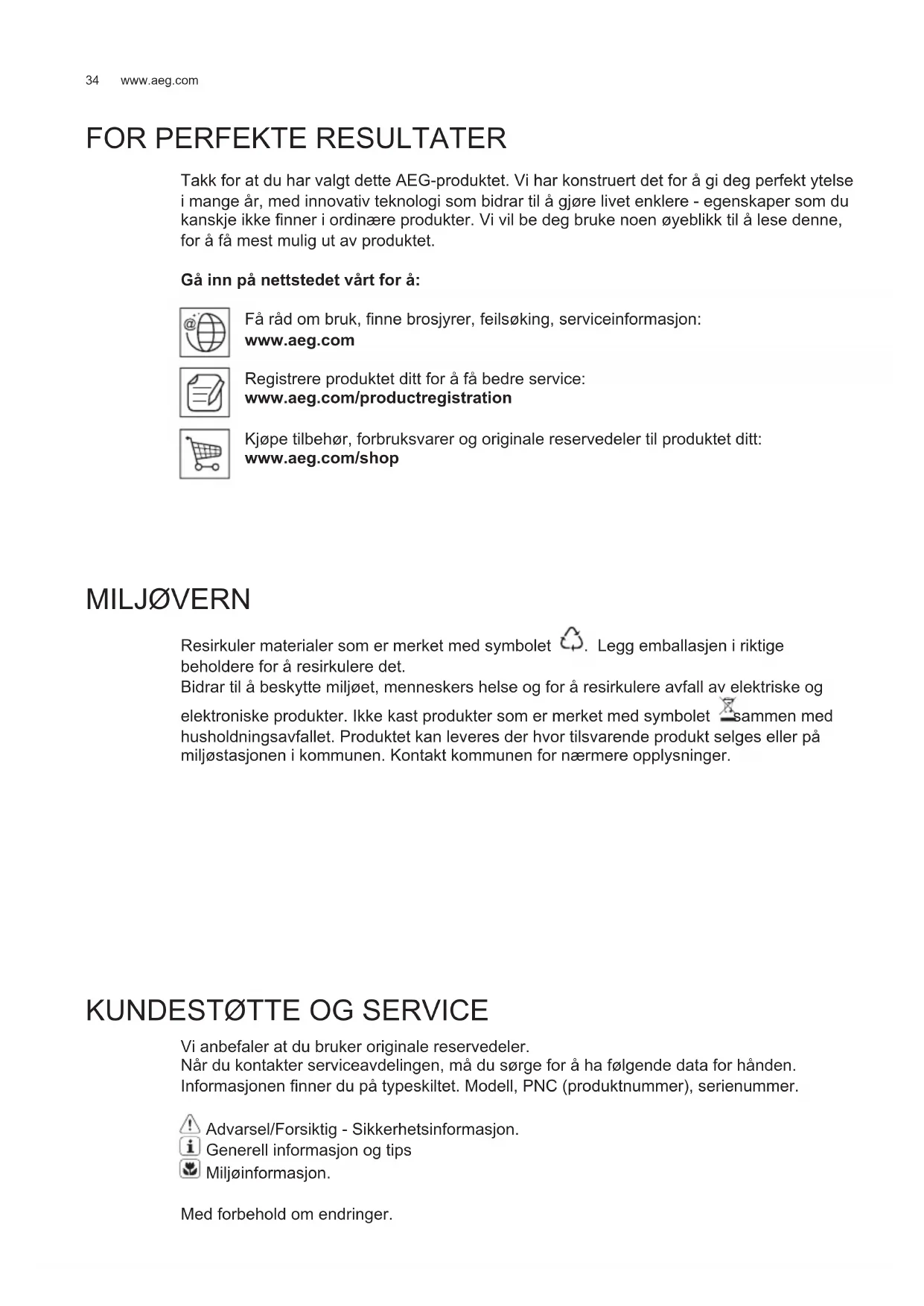 Vi anbefaler at du bruker originale reservedeler. Når du kontakter serviceavdelingen, må du sørge for å ha følgende data for hånden. Informasjonen finner du på typeskiltet. Modell, PNC (produktnummer), serienummer. Advarsel/Forsiktig - Sikkerhetsinformasjon. Generell informasjon og tips Miljøinformasjon. Med forbehold om endringer. NO BRUKSVEILEDNING35 NORSK