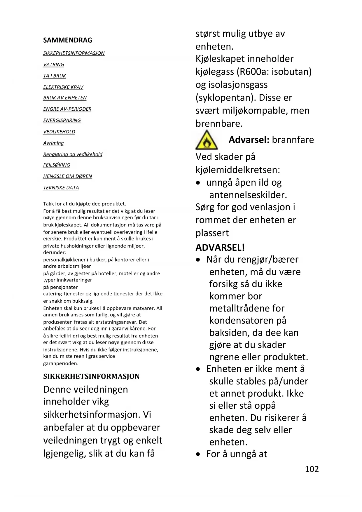 - Ikke forsøk å brenne enheten. Vær forsiktig så du ikke skader kjølekretsen/-rørene på105 enheten under transport og bruk. Hvis det har oppstått skader på enheten, må den holdes unna ild og potensielle antennelseskilder. Luft straks rommet der enheten er plassert.