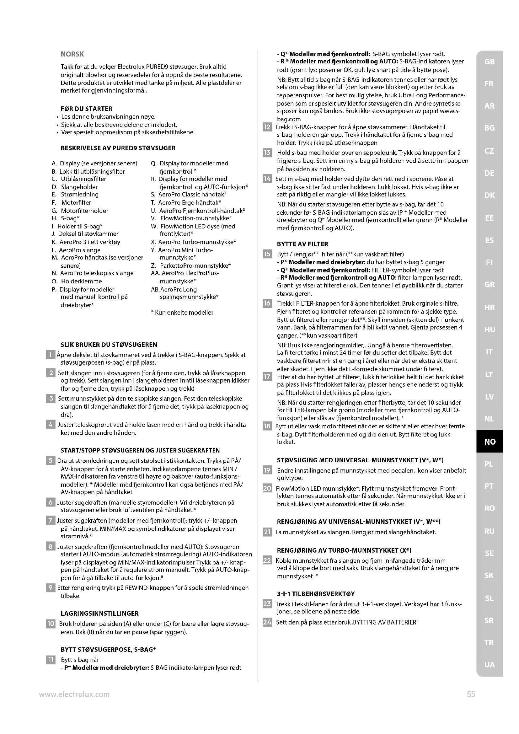 UANORSK Takk for at du velger Electrolux PURED9 støvsuger. Bruk alltid originalt tilbehør og reservedeler for å oppnå de beste resultatene. Dette produktet er utviklet med tanke på miljøet. Alle plastdeler er merket for gjenvinningsformål.