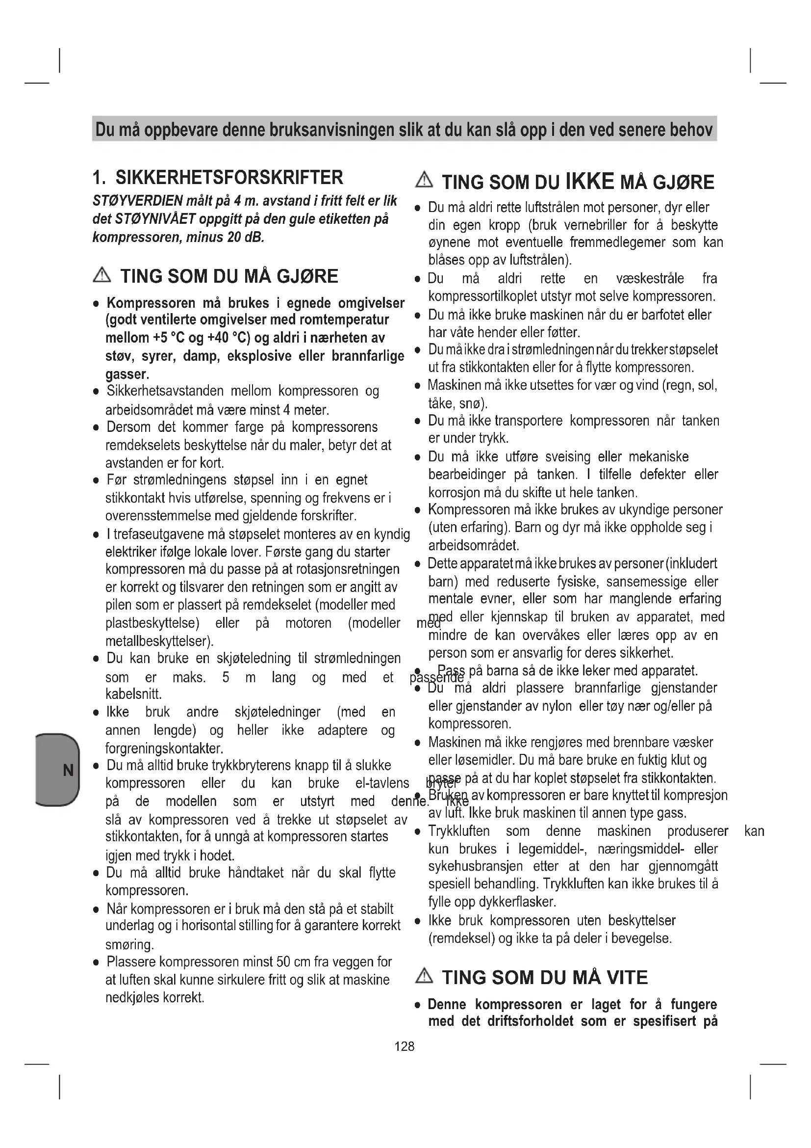 ● Kompressoren må brukes i egnede omgivelser (godt ventilerte omgivelser med romtemperatur mellom +5 °C og +40 °C) og aldri i nærheten av støv, syrer, damp, eksplosive eller brannfarlige gasser. ● Sikkerhetsavstanden mellom kompressoren og arbeidsområdetmåværeminst4meter. ● Dersom det kommer farge på kompressorens remdekselets beskyttelse når du maler, betyr det at avstandenerforkort. ● Før strømledningens støpsel inn i en egnet stikkontakt hvis utførelse, spenning og frekvens er i overensstemmelsemedgjeldendeforskrifter. ● I trefaseutgavene må støpselet monteres av en kyndig elektrikerifølgelokalelover.Førstegangdustarter kompressoren må du passe på at rotasjonsretningen er korrekt og tilsvarer den retningen som er angitt av pilensomerplassertpåremdekselet(modellermed plastbeskyttelse) eller på motoren (modeller med metallbeskyttelser). ● Du kan bruke en skjøteledning til strømledningen som er maks. 5 m lang og med et passende kabelsnitt. ● Ikke bruk andre skjøteledninger (med en annen lengde) og heller ikke adaptere og forgreningskontakter. ● Du må alltid bruke trykkbryterens knapp til å slukke kompressoren eller du kan bruke el-tavlens bryter på de modellen som er utstyrt med denne. Ikke slå av kompressoren ved å trekke ut støpselet av stikkontakten, for å unngå at kompressoren startes igjenmedtrykkihodet. ● Du må alltid bruke håndtaket når du skal flytte kompressoren. ● Når kompressoren er i bruk må den stå på et stabilt underlag og i horisontal stilling for å garantere korrekt smøring. ● Plassere kompressoren minst 50 cm fra veggen for at luften skal kunne sirkulere fritt og slik at maskine nedkjøleskorrekt. TING SOM DU IKKE MÅ GJØRE ● Du må aldri rette luftstrålen mot personer, dyr eller din egen kropp (bruk vernebriller for å beskytte øynene mot eventuelle fremmedlegemer som kan blåsesoppavluftstrålen). ● Du må aldri rette en væskestråle fra kompressortilkopletutstyrmotselvekompressoren. ● Du må ikke bruke maskinen når du er barfotet eller harvåtehenderellerføtter.