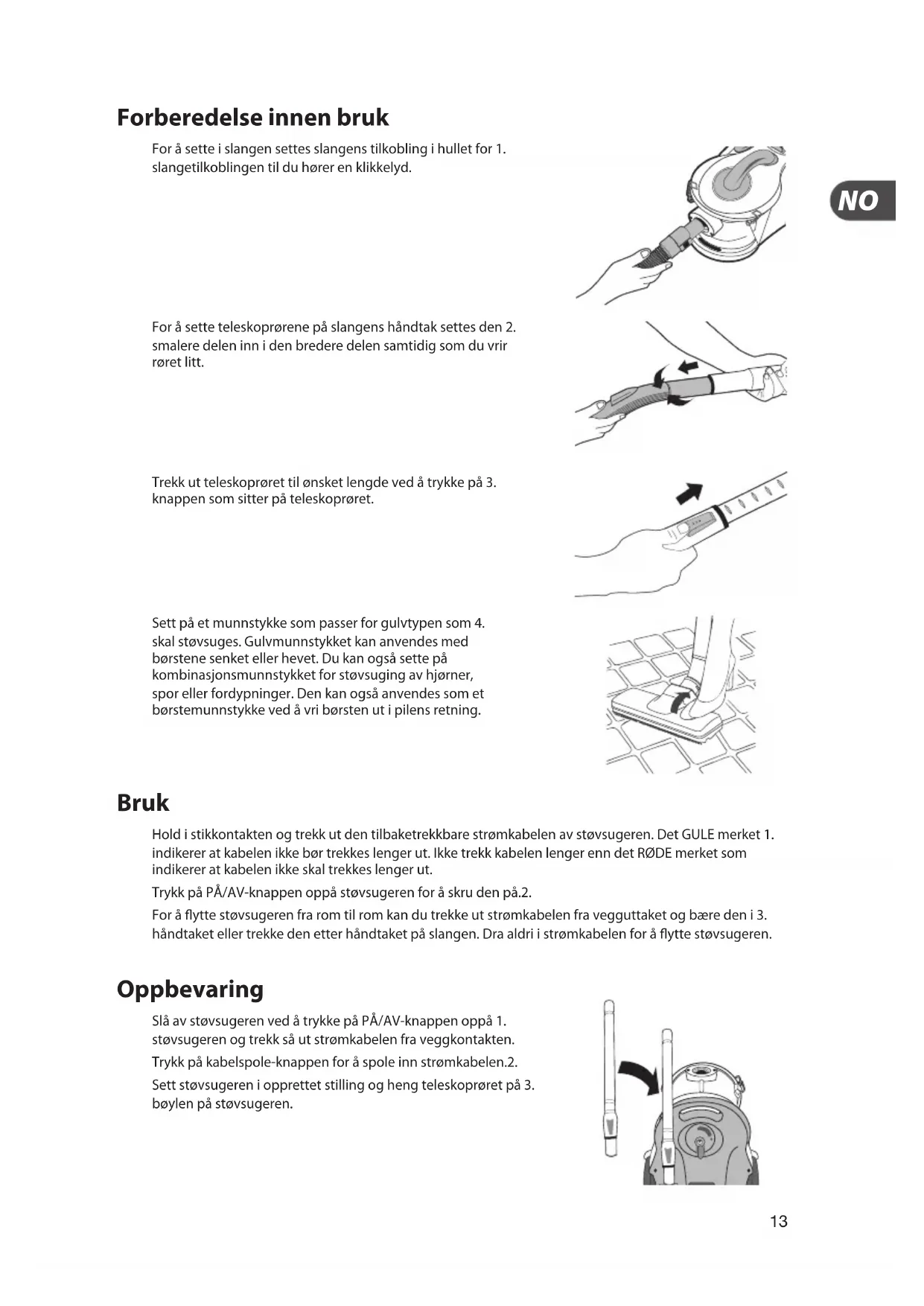 Trekk ut teleskoprøret til ønsket lengde ved å trykke på 3. knappen som sitter på teleskoprøret. Forberedelse innen bruk For å sette i slangen settes slangens tilkobling i hullet for 1. slangetilkoblingen til du hører en klikkelyd. For å sette teleskoprørene på slangens håndtak settes den 2. smalere delen inn i den bredere delen samtidig som du vrir røret litt. Bruk Hold i stikkontakten og trekk ut den tilbaketrekkbare strømkabelen av støvsugeren. Det GULE merket 1. indikerer at kabelen ikke bør trekkes lenger ut. Ikke trekk kabelen lenger enn det RØDE merket som indikerer at kabelen ikke skal trekkes lenger ut. Trykk på PÅ/AV-knappen oppå støvsugeren for å skru den på.2. For å ytte støvsugeren fra rom til rom kan du trekke ut strømkabelen fra vegguttaket og bære den i 3. håndtaket eller trekke den etter håndtaket på slangen. Dra aldri i strømkabelen for å ytte støvsugeren. Oppbevaring Slå av støvsugeren ved å trykke på PÅ/AV-knappen oppå 1. støvsugeren og trekk så ut strømkabelen fra veggkontakten. Trykk på kabelspole-knappen for å spole inn strømkabelen.2. Sett støvsugeren i opprettet stilling og heng teleskoprøret på 3. bøylen på støvsugeren. Sett på et munnstykke som passer for gulvtypen som 4. skal støvsuges. Gulvmunnstykket kan anvendes med børstene senket eller hevet. Du kan også sette på kombinasjonsmunnstykket for støvsuging av hjørner, spor eller fordypninger. Den kan også anvendes som et børstemunnstykke ved å vri børsten ut i pilens retning.14