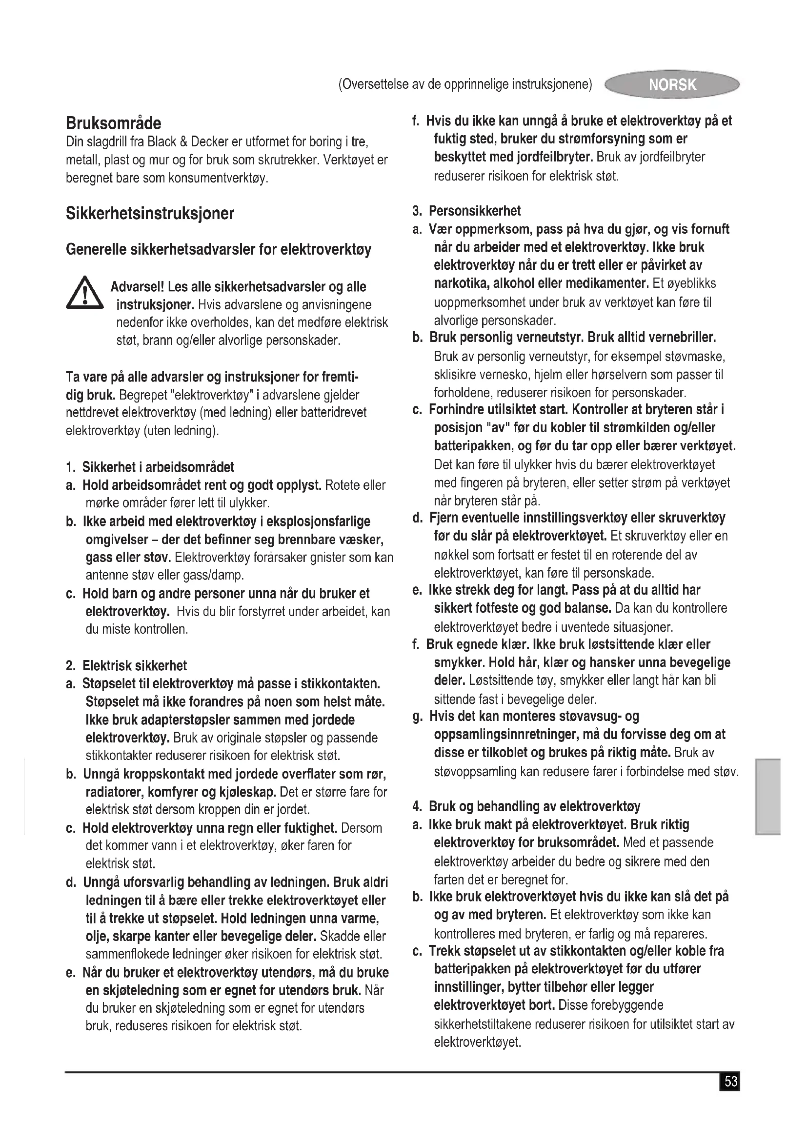 (Oversettelse av de opprinnelige instruksjonene) NORSK Garanti Black & Decker er trygg på kvaliteten på sine produkter og tilb- yr en enestående garanti. Denne garantierklæringen kommer i tillegg til dine lovbestemte rettigheter og er ikke i konikt med disse. Garantien er gyldig i EU- og EFTA-medlemsstatene. Hvis et Black & Decker-produkt går i stykker på grunn av material- og/eller fabrikasjonsfeil eller har mangler i forhold til spesikasjonene innen 24 måneder fra kjøpet, påtar Black & Decker seg å skifte ut defekte deler, reparere produkter som har vært utsatt for alminnelig slitasje, eller bytte ut slike produkter med minst mulig vanskelighet for kunden, med mindre: u Produktet har vært brukt i yrkes-/næringsvirksomhet eller til utleie. u Produktet har vært utsatt for feilaktig bruk eller dårlig vedlikehold. u Produktet har blitt skadet av fremmede gjenstander eller stoffer eller ved et uhell. u Andre enn autoriserte serviceverksteder eller Black & Deckers serviceteknikere har forsøk å reparere produktet. For å ta garantien i bruk må du vise kjøpskvittering til forhandleren eller til et autorisert serviceverksted. Du kan nne ut hvor nærmeste autoriserte serviceverksted er, ved å kontakte din lokale Black & Decker-avdeling på adressen som er oppgitt i denne håndboken. En oversikt over autoriserte Black & Decker-serviceverksteder og alle opplysninger om ettersalgsservice og kontakter er også tilgjengelig på Internett: www.2helpU.com Besøk vårt webområde www.blackanddecker.no for å registrere ditt nye Black & Decker-produkt og for å holde deg oppdatert om nye produkter og spesialtilbud. Du nner mer informasjon om Black & Decker og produktutvalget vårt på www.blackanddecker.no.59 (Oversættelse af de oprindelige instruktioner) DANSK Tilsigtet brug Din slagboremaskine fra Black & Decker er designet til bor- ing i træ, metal, plastic og murværk og som skruetrækker. Værktøjet er kun beregnet til privat brug. Sikkerhedsanvisninger Generelle sikkerhedsadvarsler vedrørende elværk- tøj