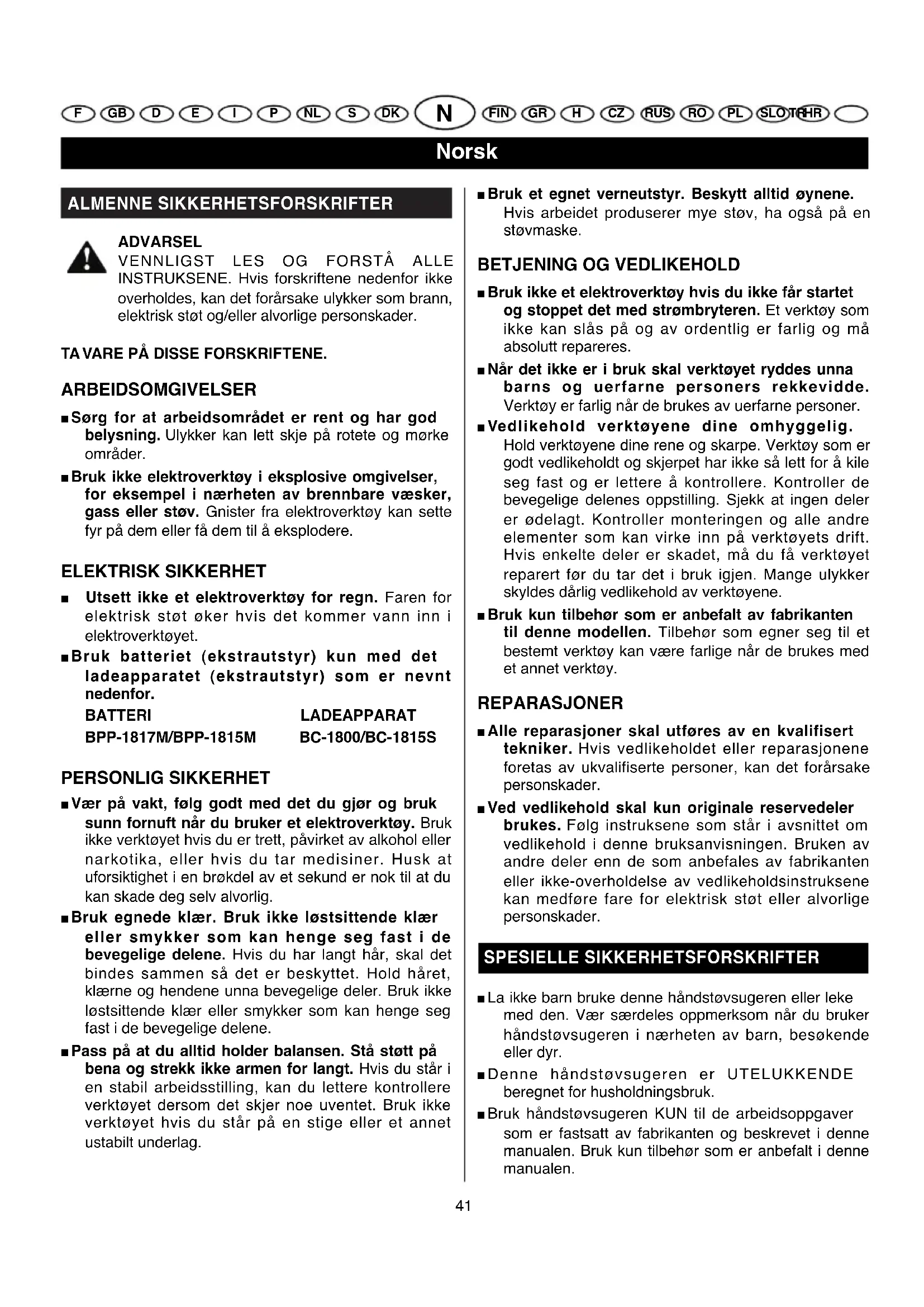 ■ Bruk ikke et elektroverktøy hvis du ikke får startet og stoppet det med strømbryteren. Et verktøy som ikke kan slås på og av ordentlig er farlig og må absolutt repareres. ■ Når det ikke er i bruk skal verktøyet ryddes unna barns og uerfarne personers rekkevidde. Verktøy er farlig når de brukes av uerfarne personer. ■ Vedlikehold verktøyene dine omhyggelig. Hold verktøyene dine rene og skarpe. Verktøy som er godt vedlikeholdt og skjerpet har ikke så lett for å kile seg fast og er lettere å kontrollere. Kontroller de bevegelige delenes oppstilling. Sjekk at ingen deler er ødelagt. Kontroller monteringen og alle andre elementer som kan virke inn på verktøyets drift. Hvis enkelte deler er skadet, må du få verktøyet reparert før du tar det i bruk igjen. Mange ulykker skyldes dårlig vedlikehold av verktøyene. ■ Bruk kun tilbehør som er anbefalt av fabrikanten til denne modellen. Tilbehør som egner seg til et bestemt verktøy kan være farlige når de brukes med et annet verktøy. REPARASJONER ■ Alle reparasjoner skal utføres av en kvalifisert tekniker. Hvis vedlikeholdet eller reparasjonene foretas av ukvalifiserte personer, kan det forårsake personskader. ■ Ved vedlikehold skal kun originale reservedeler brukes. Følg instruksene som står i avsnittet om vedlikehold i denne bruksanvisningen. Bruken av andre deler enn de som anbefales av fabrikanten eller ikke-overholdelse av vedlikeholdsinstruksene kan medføre fare for elektrisk støt eller alvorlige personskader. SPESIELLE SIKKERHETSFORSKRIFTER ■ La ikke barn bruke denne håndstøvsugeren eller leke med den. Vær særdeles oppmerksom når du bruker håndstøvsugeren i nærheten av barn, besøkende eller dyr. ■ Denne håndstøvsugeren er UTELUKKENDE beregnet for husholdningsbruk. ■ Bruk håndstøvsugeren KUN til de arbeidsoppgaver som er fastsatt av fabrikanten og beskrevet i denne manualen. Bruk kun tilbehør som er anbefalt i denne manualen.