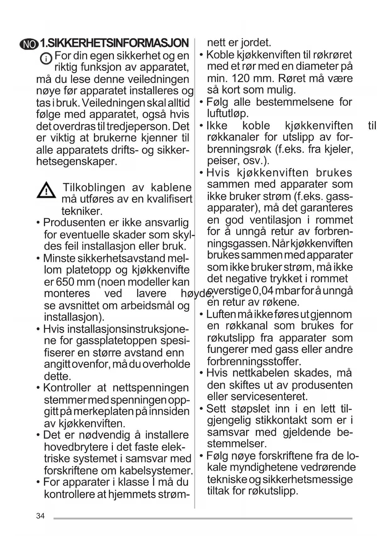 - Hvis kjøkkenviften brukes sammen med apparater som ikke bruker strøm (f.eks. gass- apparater), må det garanteres en god ventilasjon i rommet for å unngå retur av forbren- ningsgassen. Når kjøkkenviften brukes sammen med apparater som ikke bruker strøm, må ikke detnegativetrykketirommet overstige 0,04 mbar for å unngå en retur av røkene.