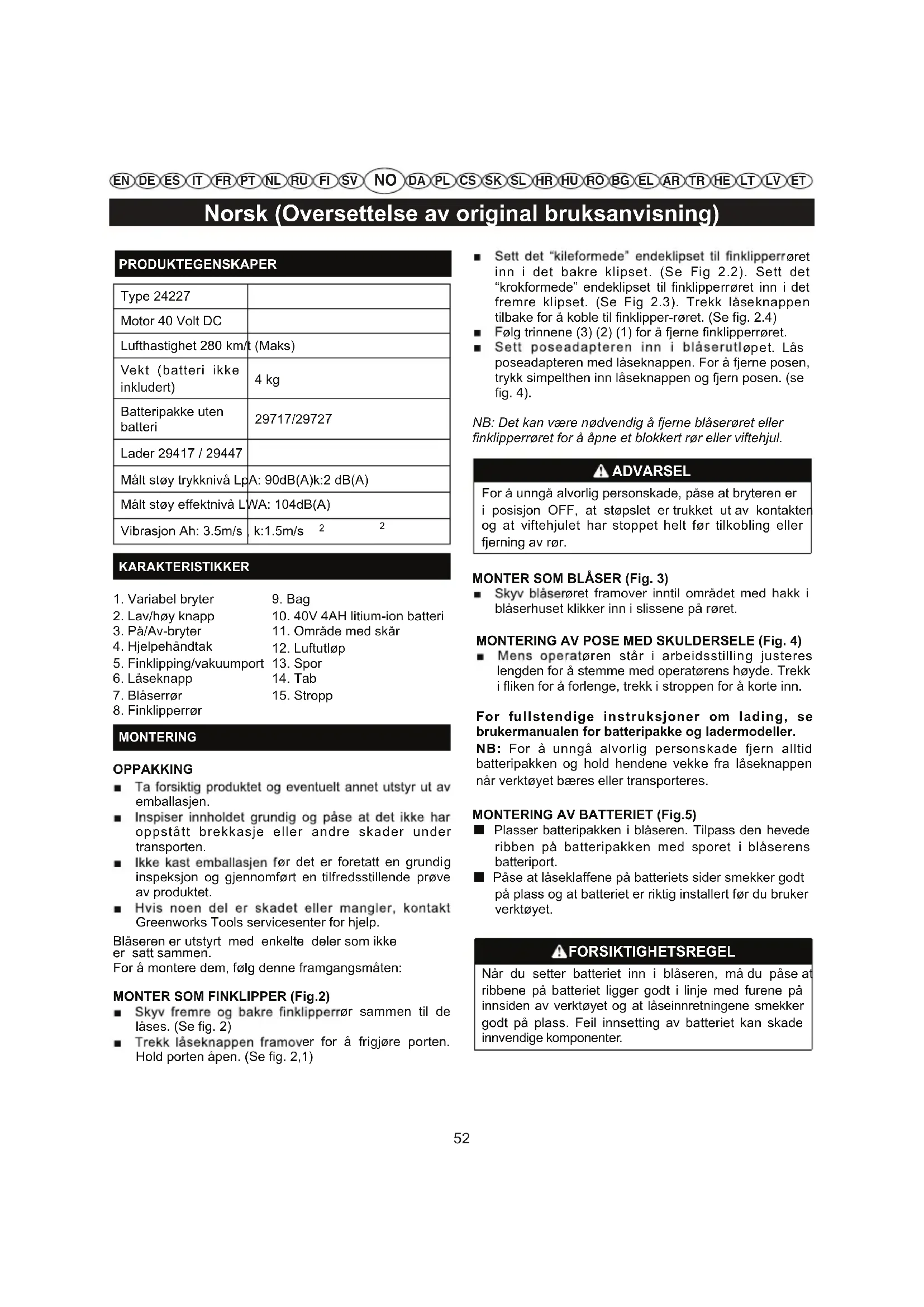 MONTERING OPPAKKING emballasjen. oppstått brekkasje eller andre skader under transporten. ør det er foretatt en grundig inspeksjon og gjennomført en tilfredsstillende prøve av produktet. Greenworks Tools servicesenter for hjelp. utstyrt med enkelte deler som ikke er satt sammen. For å montere dem, følg denne framgangsmåten: MONTER SOM FINKLIPPER (Fig.2) ør sammen til de låses. (Se fig. 2) er for å frigjøre porten. Hold porten åpen. (Se fig. 2,1) øret inn i det bakre klipset. (Se Fig 2.2). Sett det “krokformede” endeklipset til finklipperrøret inn i det fremre klipset. (Se Fig 2.3). Trekk låseknappen tilbake for å koble til finklipper-røret. (Se fig. 2.4) ølg trinnene (3) (2) (1) for å fjerne finklipperrøret. øpet. Lås poseadapteren med låseknappen. For å fjerne posen, trykk simpelthen inn låseknappen og fjern posen. (se fig. 4). NB: Det kan være nødvendig å fjerne blåserøret eller finklipperrøret for å åpne et blokkert rør eller viftehjul. ADVARSEL For å unngå alvorlig personskade, påse at bryteren er i posisjon OFF, at støpslet er trukket ut av kontakten og at viftehjulet har stoppet helt før tilkobling eller fjerning av rør. MONTER SOM BLÅSER (Fig. 3) øret framover inntil området med hakk i blåserhuset klikker inn i slissene på røret. MONTERING AV POSE MED SKULDERSELE (Fig. 4) øren står i arbeidsstilling justeres lengden for å stemme med operatørens høyde. Trekk i fliken for å forlenge, trekk i stroppen for å korte inn. For fullstendige instruksjoner om lading, se brukermanualen for batteripakke og ladermodeller. NB: For å unngå alvorlig personskade fjern alltid batteripakken og hold hendene vekke fra låseknappen når verktøyet bæres eller transporteres. MONTERING AV BATTERIET (Fig.5) ■ Plasser batteripakken i blåseren. Tilpass den hevede ribben på batteripakken med sporet i blåserens batteriport. ■ Påse at låseklaffene på batteriets sider smekker godt på plass og at batteriet er riktig installert før du bruker verktøyet. FORSIKTIGHETSREGEL Når du setter batteriet inn i blåseren, må du påse at ribbene på batteriet ligger godt i linje med furene på innsiden av verktøyet og at låseinnretningene smekker godt på plass. Feil innsetting av batteriet kan skade innvendige komponenter.