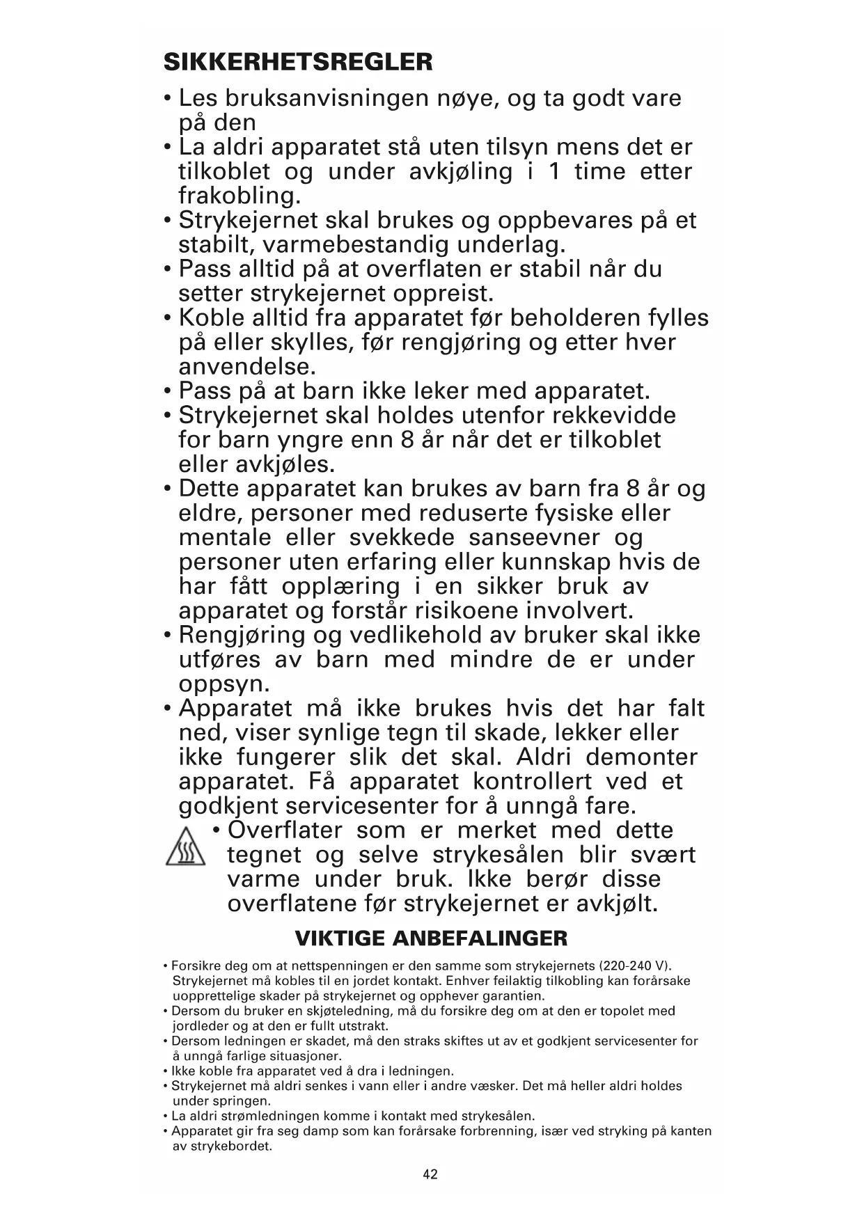 - Overflater som er merket med dette tegnet og selve strykesålen blir svært varme under bruk. Ikke berør disse overflatene før strykejernet er avkjølt. VIKTIGE ANBEFALINGER