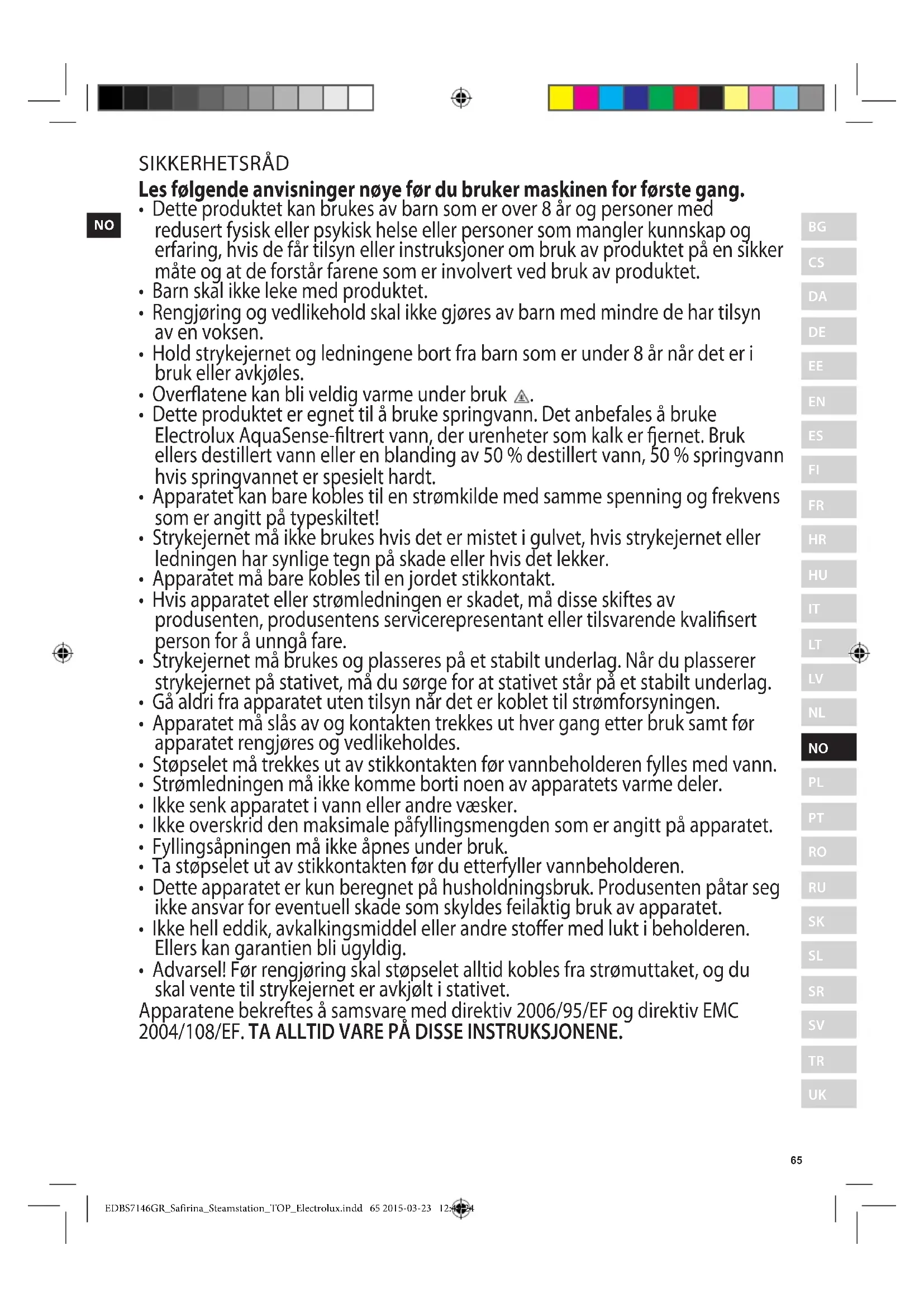 EDBS7146GR_Safirina_Steamstation_TOP_Electrolux.indd 64 2015-03-23 12:49:23NO SIKKERHETSRÅD Les følgende anvisninger nøye før du bruker maskinen for første gang.