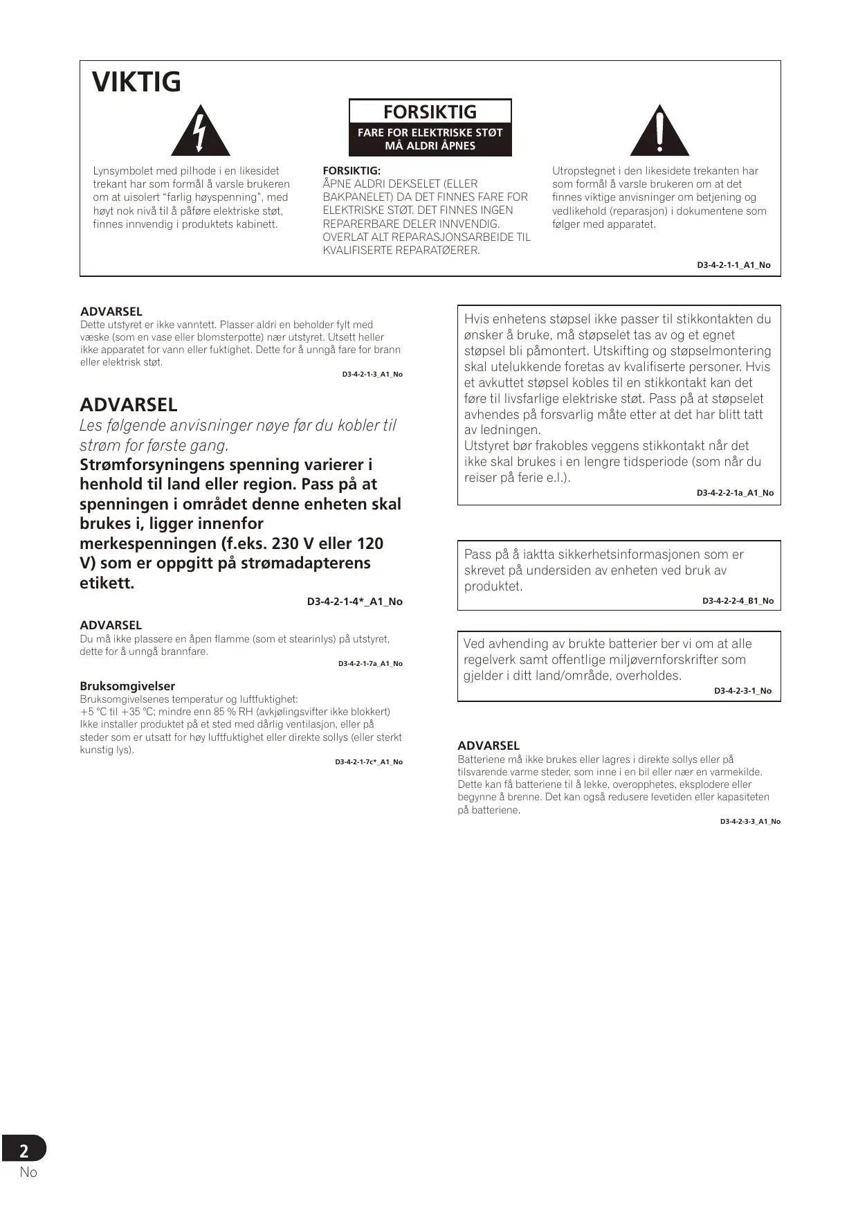 ADVARSEL Dette utstyret er ikke vanntett. Plasser aldri en beholder fylt med væske (som en vase eller blomsterpotte) nær utstyret. Utsett heller ikke apparatet for vann eller fuktighet. Dette for å unngå fare for brann eller elektrisk støt. D3-4-2-1-3_A1_No