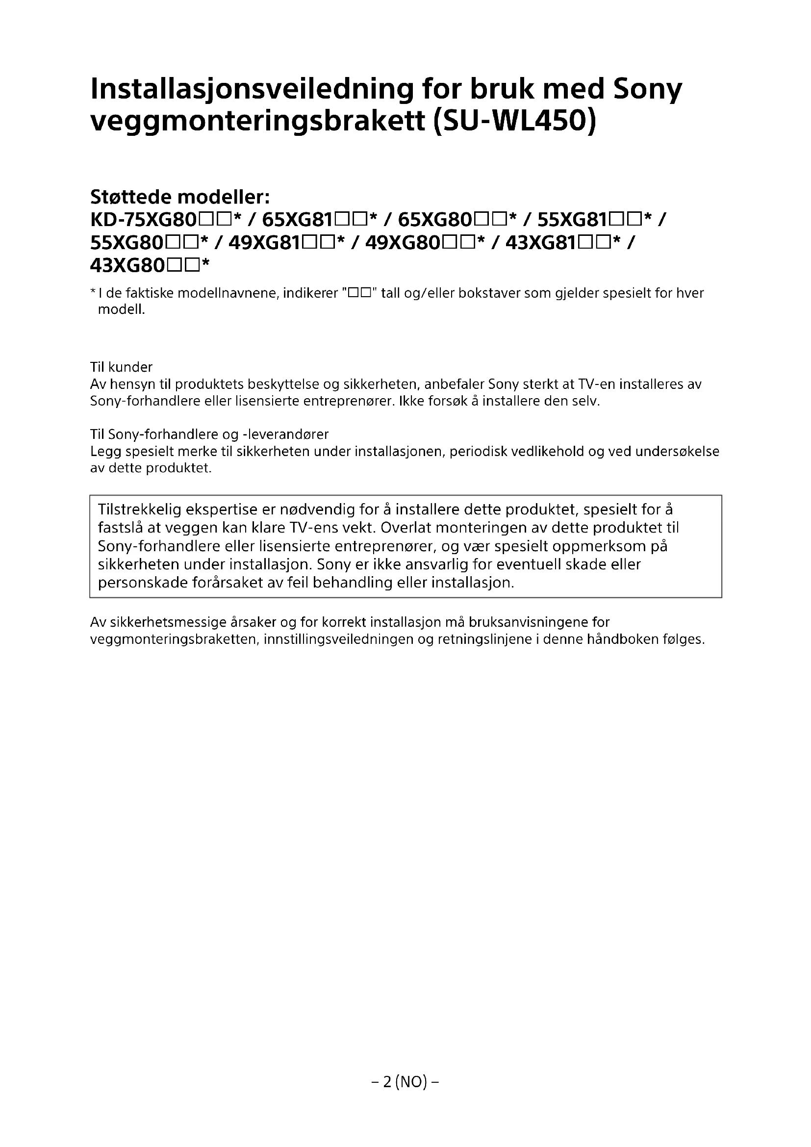Tilstrekkelig ekspertise er nodvendig for a montere dette produktet. Les noye gjennom donne bruksanvisingen for a gjoare installasjonen pa en trygg mate. Sony er ici ansvarlige for skader aller personskader som oppstar som folge av feil handtering ell installationj. Gi dette handboken til kunden etter installationj.