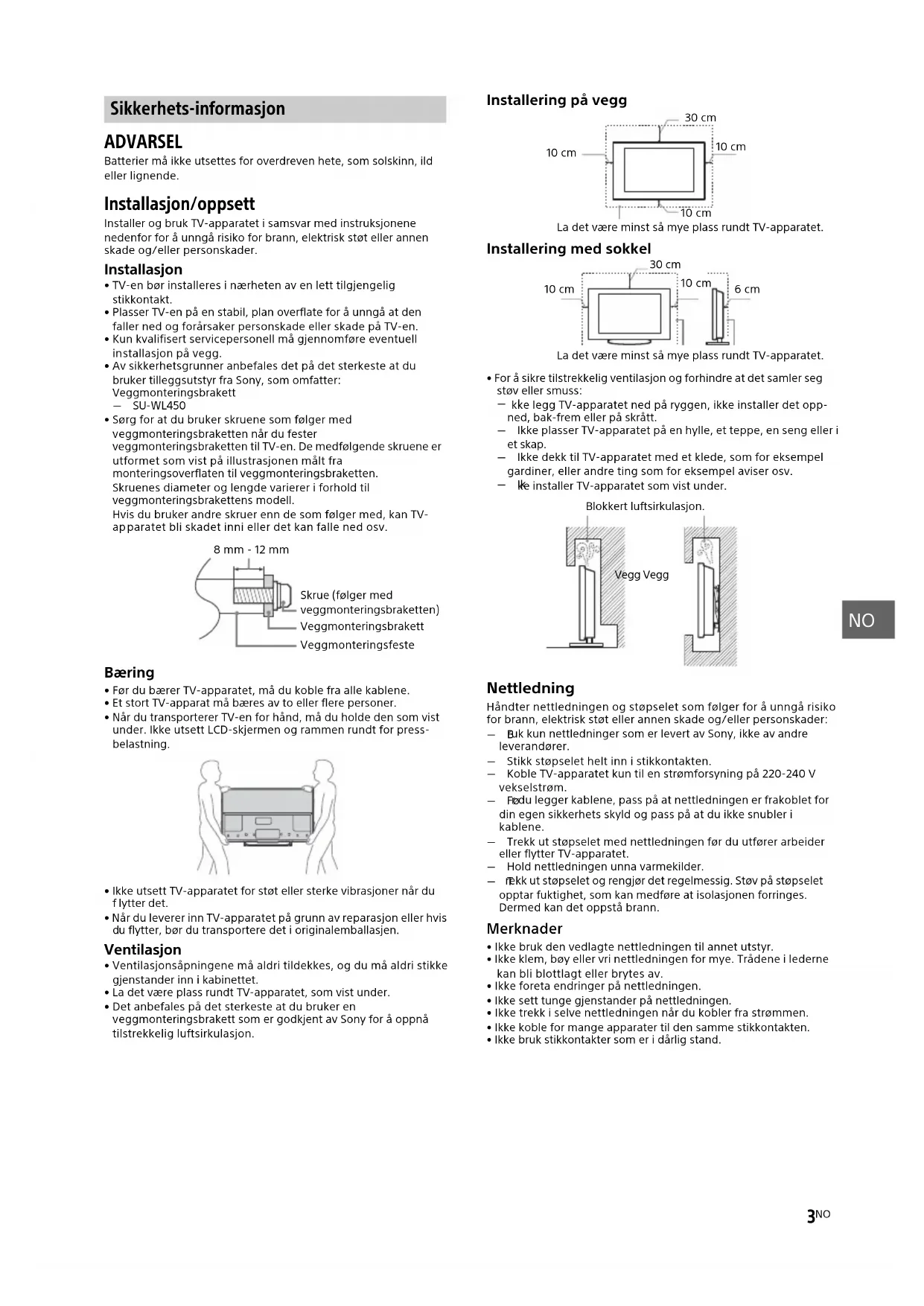 - Ikke bruk stikkontakter som er i dårlig stand. Sikkerhets-informasjon Skrue (følger med veggmonteringsbraketten) Veggmonteringsbrakett 8 mm - 12 mm Veggmonteringsfeste 30 cm 10 cm 10 cm 10 cm La det være minst så mye plass rundt TV-apparatet. 30 cm 10 cm 10 cm La det være minst så mye plass rundt TV-apparatet. 6 cm Blokkert luftsirkulasjon. Vegg Vegg4