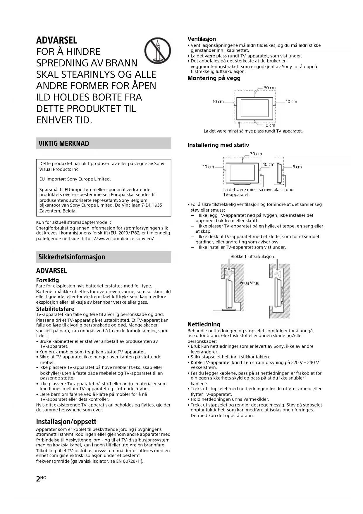 ENHVER TID. VIKTIG MERKNAD Kun for aktuell strømadaptermodell: Energiforbruket og annen informasjon for strømforsyningen slik det kreves i kommisjonens forskrift (EU) 2019/1782, er tilgjengelig på følgende nettside: https://www.compliance.sony.eu/ Sikkerhetsinformasjon ADVARSEL Forsiktig Fare for eksplosjon hvis batteriet erstattes med feil type. Batterier må ikke utsettes for overdreven varme, som solskinn, ild eller lignende, eller for ekstremt lavt lufttrykk som kan medføre eksplosjon eller lekkasje av brennbar væske eller gass. Stabilitetsfare TV-apparatet kan falle og føre til alvorlig personskade og død. Plasser aldri et TV-apparat på et ustabilt sted. Et TV-apparat kan falle og føre til alvorlig personskade og død. Mange skader, spesielt på barn, kan unngås ved å ta enkle forholdsregler, som f.eks.: