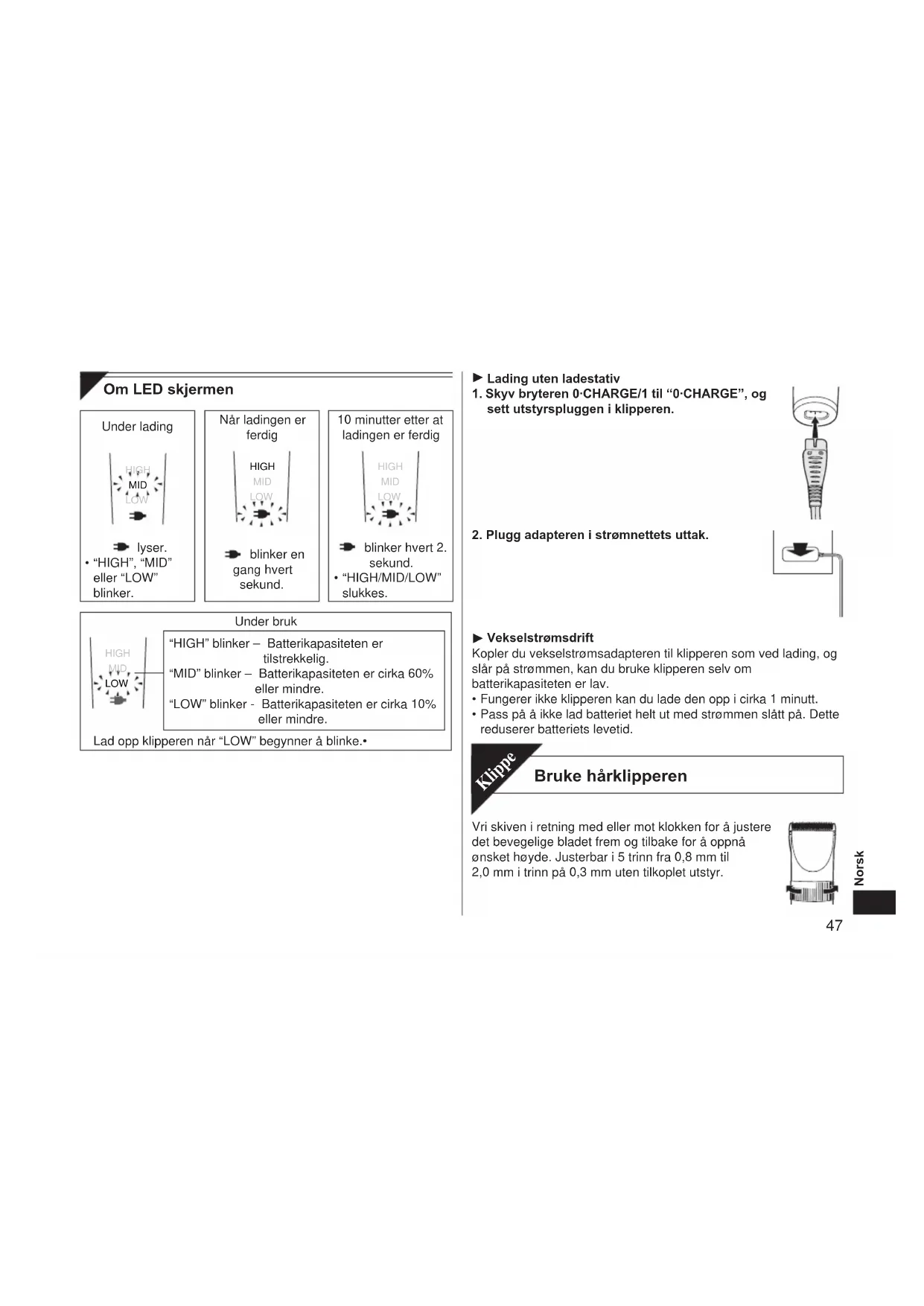 - 45 Norsk Viktig Før bruk Denne klipperen er designet for profesjonell bruk til å justere hår og skjegg. Lad den opp i 8 timer før første gangs bruk for å aktivere de innebygde oppladbare batteriene. Den kan enten brukes med en vekselstrømsadapter eller med oppladbare batterier. Les nøye gjennom hele brukerveiledningen før bruk. Lade opp klipperen Bruk hårklipperen ER1511 kun sammen med adapteren RE9‑41. Unngå å lade batteriene ved temperaturer under 5 °C eller over 35 °C. Unngå å lade opp batteriene i direkte sollys eller i nærheten av en strålende varmekilde. Ladestatus ( ) lampen kan blinke tidlig i ladingen ved første gangs lading eller dersom den ikke har vært i bruk på 6 eller ere måneder, selv om den er fulladet. Dette er ikke en feil. Selv om klipperen ikke brukes i en lengre periode, bør den lades opp hver 6. måned for å bevare batterienes levetid. Strømkabelen kan ikke byttes ut. Er den skadet må vekselstrømsadapteren kasseres. Bruke klipperen Advarsel – hold apparatet tørt. Klipperen kan bli varm under bruk og/eller lading. Dette er normalt. Kontroller at bladene og festene ikke er skadet før bruk. Bytt dem ut hvis de er skadet. Du bør unngå at hovedhuset eller bladene kommer i direkte kontakt med permanent bølgekrem, hårgjenoppretter eller hårspray. Skjer dette kan det oppstå sprekker, misfarging eller rust. Du bør ikke miste klipperen ned på gulvet. Du bør ikke slå bladene eller festet mot harde gjenstander. Du bør ikke bruke klipperen til å klippe håret til et kjæledyr.