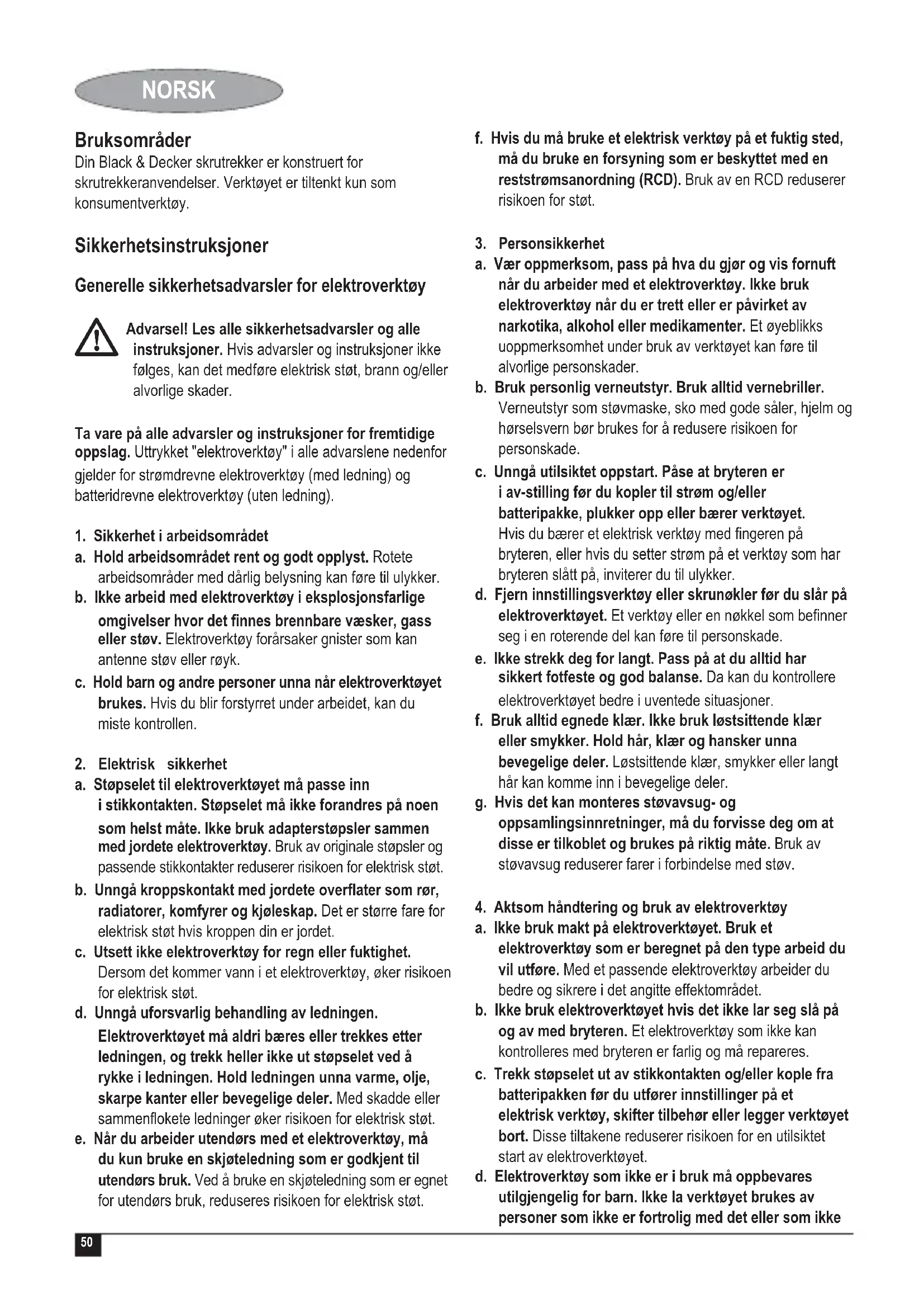 f. Hvis du ma bruke et elektrisk verktoy pa et fuktig sted, ma du bruke en forsyning som er beskyttet med en reststromsanordning (RCD). Bruk av en RCD reduserer risikoen for stot.