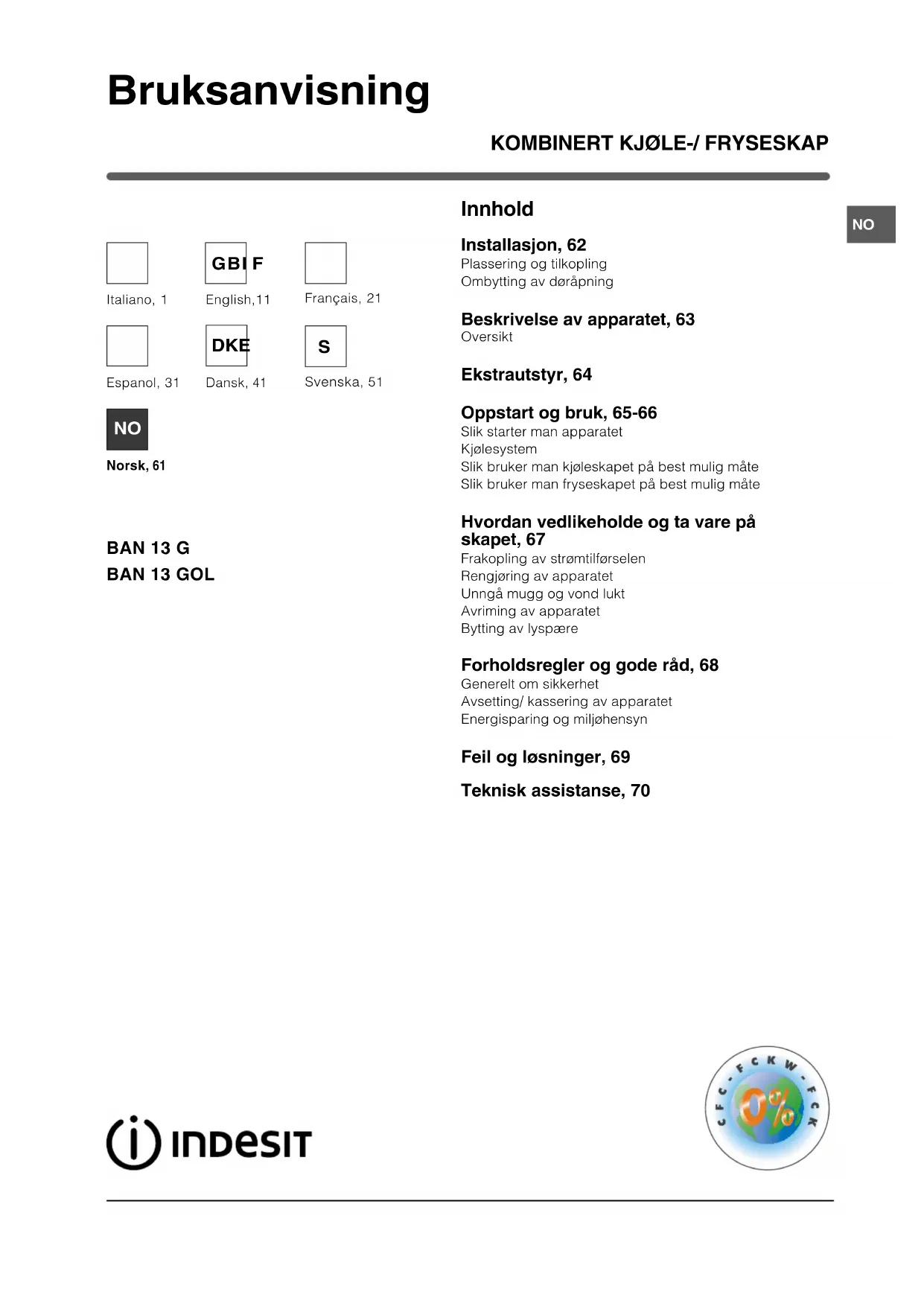 Innhold Installasjon, 62 Plassering og tilkopling Ombytting av døråpning Beskrivelse av apparatet, 63 Oversikt Ekstrautstyr, 64 Oppstart og bruk, 65-66 Slik starter man apparatet Kjølesystem Slik bruker man kjøleskapet på best mulig måte Slik bruker man fryseskapet på best mulig måte Hvordan vedlikeholde og ta vare på skapet, 67 Frakopling av strømtilførselen Rengjøring av apparatet Unngå mugg og vond lukt Avriming av apparatet Bytting av lyspære Forholdsregler og gode råd, 68 Generelt om sikkerhet Avsetting/ kassering av apparatet Energisparing og miljøhensyn Feil og løsninger, 69 Teknisk assistanse, 70 BAN 13 G BAN 13 GOL Italiano, 1Français, 21English,11 GBI F Dansk , 41 Espanol, 31 DKE Svenska, 51