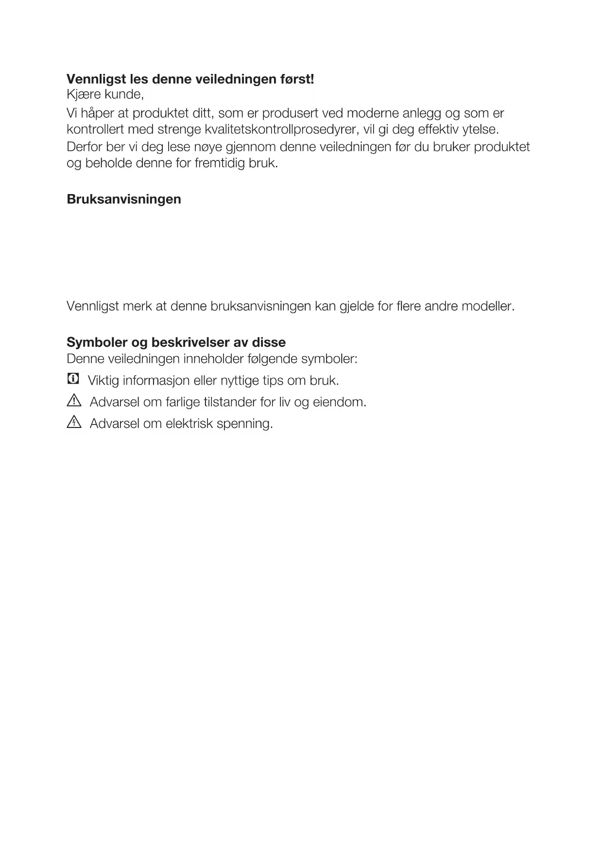 - Les også de andre dokumentene som ble levert sammen med produktet. Vennligst merk at denne bruksanvisningen kan gjelde for flere andre modeller. Symboler og beskrivelser av disse Denne veiledningen inneholder følgende symboler: C Viktig informasjon eller nyttige tips om bruk. A Advarsel om farlige tilstander for liv og eiendom. B Advarsel om elektrisk spenning.NO
