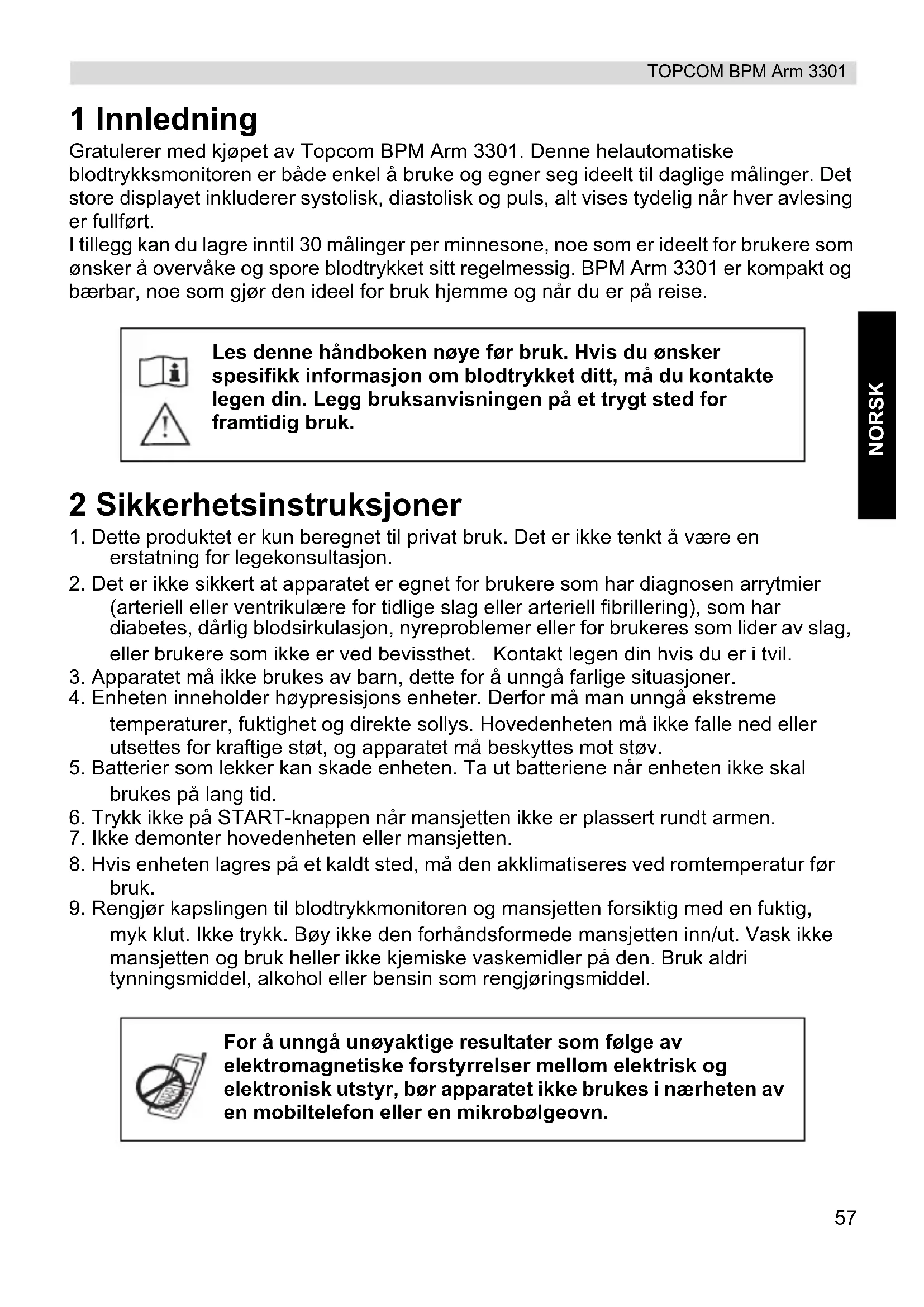 myk klut. Ikke trykk. Bøy ikke den forhåndsformede mansjetten inn/ut. Vask ikke mansjetten og bruk heller ikke kjemiske vaskemidler på den. Bruk aldri tynningsmiddel, alkohol eller bensin som rengjøringsmiddel. Les denne håndboken nøye før bruk. Hvis du ønsker spesifikk informasjon om blodtrykket ditt, må du kontakte legen din. Legg bruksanvisningen på et trygt sted for framtidig bruk. For å unngå unøyaktige resultater som følge av elektromagnetiske forstyrrelser mellom elektrisk og elektronisk utstyr, bør apparatet ikke brukes i nærheten av en mobiltelefon eller en mikrobølgeovn.58 TOPCOM BPM Arm 3301 3 Nyttige tips Her er noen nyttige tips som bidrar til at du får mer nøyaktige avlesinger