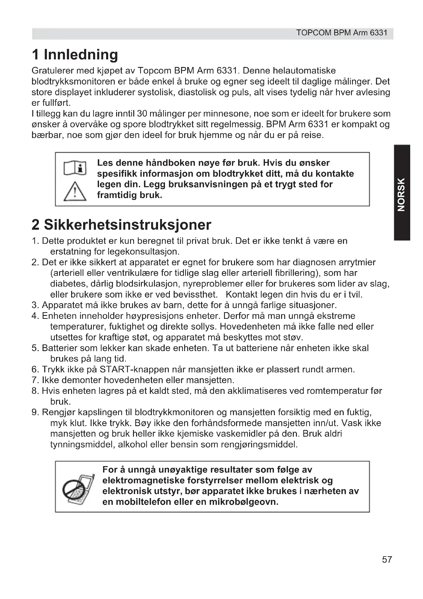 NORSK TOPCOM BPM Arm 6331 1 Innledning Gratulerer med kjøpet av Topcom BPM Arm 6331. Denne helautomatiske blodtrykksmonitoren er både enkel å bruke og egner seg ideelt til daglige målinger. Det store displayet inkluderer systolisk, diastolisk og puls, alt vises tydelig når hver avlesing er fullført. I tillegg kan du lagre inntil 30 målinger per minnesone, noe som er ideelt for brukere som ønsker å overvåke og spore blodtrykket sitt regelmessig. BPM Arm 6331 er kompakt og bærbar, noe som gjør den ideel for bruk hjemme og når du er på reise. 2 Sikkerhetsinstruksjoner