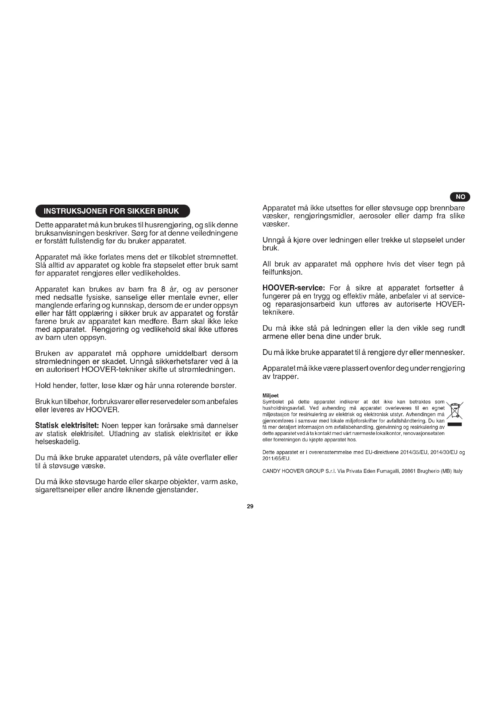 Dette apparatet må kun brukes til husrengjøring, og slik denne bruksanvisningen beskriver. Sørg for at denne veiledningene er forstått fullstendig før du bruker apparatet. Apparatet må ikke forlates mens det er tilkoblet strømnettet. Slå alltid av apparatet og koble fra støpselet etter bruk samt før apparatet rengjøres eller vedlikeholdes. Apparatet kan brukes av barn fra 8 år, og av personer med nedsatte fysiske, sanselige eller mentale evner, eller manglende erfaring og kunnskap, dersom de er under oppsyn eller har fått opplæring i sikker bruk av apparatet og forstår farene bruk av apparatet kan medføre. Barn skal ikke leke med apparatet. Rengjøring og vedlikehold skal ikke utføres av barn uten oppsyn. Bruken av apparatet må opphøre umiddelbart dersom strømledningen er skadet. Unngå sikkerhetsfarer ved å la en autorisert HOOVER-tekniker skifte ut strømledningen. Hold hender, føtter, løse klær og hår unna roterende børster. Bruk kun tilbehør, forbruksvarer eller reservedeler som anbefales eller leveres av HOOVER. Statisk elektrisitet: Noen tepper kan forårsake små dannelser av statisk elektrisitet. Utladning av statisk elektrisitet er ikke helseskadelig. Du må ikke bruke apparatet utendørs, på våte overater eller til å støvsuge væske. Du må ikke støvsuge harde eller skarpe objekter, varm aske, sigarettsneiper eller andre liknende gjenstander. Apparatet må ikke utsettes for eller støvsuge opp brennbare væsker, rengjøringsmidler, aerosoler eller damp fra slike væsker. Unngå å kjøre over ledningen eller trekke ut støpselet under bruk. All bruk av apparatet må opphøre hvis det viser tegn på feilfunksjon. HOOVER-service: For å sikre at apparatet fortsetter å fungerer på en trygg og effektiv måte, anbefaler vi at service- og reparasjonsarbeid kun utføres av autoriserte HOVER- teknikere. Du må ikke stå på ledningen eller la den vikle seg rundt armene eller bena dine under bruk. Du må ikke bruke apparatet til å rengjøre dyr eller mennesker. Apparatet må ikke være plassert ovenfor deg under rengjøring av trapper. Miljøet Symbolet på dette apparatet indikerer at det ikke kan betraktes som husholdningsavfall. Ved avhending må apparatet overleveres til en egnet miljøstasjon for resirkulering av elektrisk og elektronisk utstyr. Avhendingen må gjennomføres i samsvar med lokale miljøforskrifter for avfallshåndtering. Du kan få mer detaljert informasjon om avfallsbehandling, gjenvinning og resirkulering av dette apparatet ved å ta kontakt med vårt nærmeste lokalkontor, renovasjonsetaten eller forretningen du kjøpte apparatet hos. Dette apparatet er i overensstemmelse med EU-direktivene 2014/35/EU, 2014/30/EU og 2011/65/EU. CANDY HOOVER GROUP S.r.l. Via Privata Eden Fumagalli, 20861 Brugherio (MB) Italy