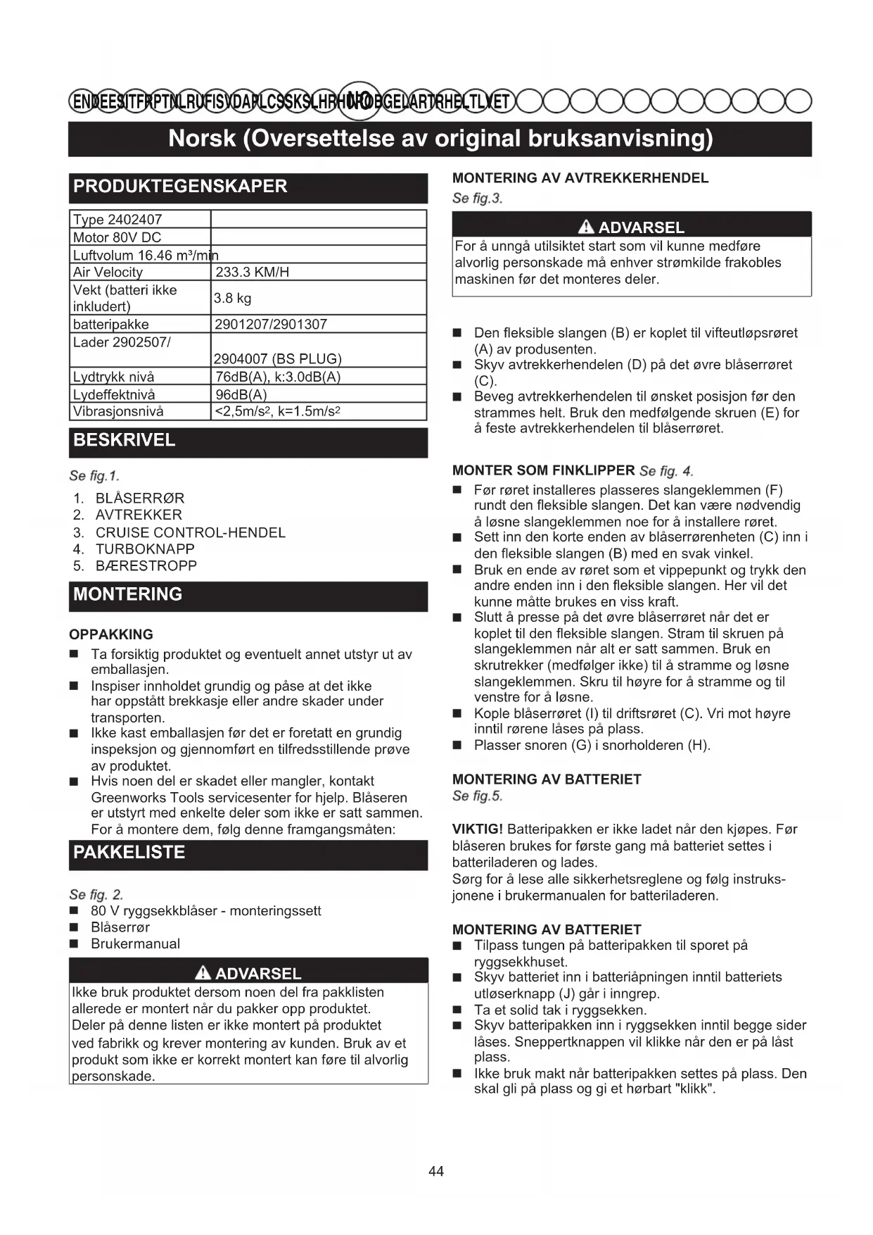 MONTERING OPPAKKING Ta forsiktig produktet og eventuelt annet utstyr ut av emballasjen. Inspiser innholdet grundig og påse at det ikke har oppstått brekkasje eller andre skader under transporten. Ikke kast emballasjen før det er foretatt en grundig inspeksjon og gjennomført en tilfredsstillende prøve av produktet. Hvis noen del er skadet eller mangler, kontakt Greenworks Tools servicesenter for hjelp. Blåseren er utstyrt med enkelte deler som ikke er satt sammen. For å montere dem, følg denne framgangsmåten: PAKKELISTE 80 V ryggsekkblåser - monteringssett Blåserrør Brukermanual ADVARSEL Ikke bruk produktet dersom noen del fra pakklistenallerede er montert når du pakker opp produktet.Deler på denne listen er ikke montert på produktetved fabrikk og krever montering av kunden. Bruk av etprodukt som ikke er korrekt montert kan føre til alvorligpersonskade.MONTERING AV AVTREKKERHENDEL ADVARSEL For å unngå utilsiktet start som vil kunne medførealvorlig personskade må enhver strømkilde frakoblesmaskinen før det monteres deler. Den fleksible slangen (B) er koplet til vifteutløpsrøret (A) av produsenten. Skyv avtrekkerhendelen (D) på det øvre blåserrøret (C). Beveg avtrekkerhendelen til ønsket posisjon før den strammes helt. Bruk den medfølgende skruen (E) for å feste avtrekkerhendelen til blåserrøret.MONTER SOM FINKLIPPER Før røret installeres plasseres slangeklemmen (F) rundt den fleksible slangen. Det kan være nødvendig å løsne slangeklemmen noe for å installere røret. Sett inn den korte enden av blåserrørenheten (C) inn i den fleksible slangen (B) med en svak vinkel. Bruk en ende av røret som et vippepunkt og trykk den andre enden inn i den fleksible slangen. Her vil det kunne måtte brukes en viss kraft. Slutt å presse på det øvre blåserrøret når det er koplet til den fleksible slangen. Stram til skruen på slangeklemmen når alt er satt sammen. Bruk en skrutrekker (medfølger ikke) til å stramme og løsne slangeklemmen. Skru til høyre for å stramme og til venstre for å løsne. Kople blåserrøret (I) til driftsrøret (C). Vri mot høyre inntil rørene låses på plass. Plasser snoren (G) i snorholderen (H).MONTERING AV BATTERIETVIKTIG! Batteripakken er ikke ladet når den kjøpes. Før blåseren brukes for første gang må batteriet settes i batteriladeren og lades.Sørg for å lese alle sikkerhetsreglene og følg instruks-jonene i brukermanualen for batteriladeren.MONTERING AV BATTERIET Tilpass tungen på batteripakken til sporet på ryggsekkhuset. Skyv batteriet inn i batteriåpningen inntil batteriets utløserknapp (J) går i inngrep. Ta et solid tak i ryggsekken. Skyv batteripakken inn i ryggsekken inntil begge sider låses. Sneppertknappen vil klikke når den er på låst plass. Ikke bruk makt når batteripakken settes på plass. Den skal gli på plass og gi et hørbart "klikk". 44Norsk (Oversettelse av original bruksanvisning)