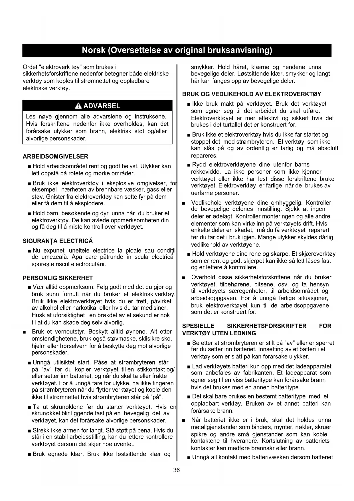 ■ Nu expuneţi uneltele electrice la ploaie sau condiţii de umezeală. Apa care pătrunde în scula electrică sporeşte riscul electrocutării. PERSONLIG SIKKERHET ■ Vær alltid oppmerksom. Følg godt med det du gjør og bruk sunn fornuft når du bruker et elektrisk verktøy. Bruk ikke elektroverktøyet hvis du er trett, påvirket av alkohol eller narkotika, eller hvis du tar medisiner. Husk at uforsiktighet i en brøkdel av et sekund er nok til at du kan skade deg selv alvorlig. ■ Bruk et verneutstyr. Beskytt alltid øynene. Alt etter omstendighetene, bruk også støvmaske, sklisikre sko, hjelm eller hørselvern for å beskytte deg mot alvorlige personskader. ■ Unngå utilsiktet start. Påse at strømbryteren står på ”av” før du kopler verktøyet til en stikkontakt og/ eller setter inn batteriet, og når du skal ta eller frakte verktøyet. For å unngå fare for ulykke, ha ikke fingeren på strømbryteren når du flytter verktøyet og kople den ikke til strømnettet hvis strømbryteren står på "på". ■ Ta ut skrunøklene før du starter verktøyet. Hvis en skrunøkkel blir liggende fast på en bevegelig del av verktøyet, kan det forårsake alvorlige personskader. ■ Strekk ikke armen for langt. Stå støtt på bena. Hvis du står i en stabil arbeidsstilling, kan du lettere kontrollere verktøyet dersom det skjer noe uventet. ■ Bruk egnede klær. Bruk ikke løstsittende klær og smykker. Hold håret, klærne og hendene unna bevegelige deler. Løstsittende klær, smykker og langt hår kan fanges opp av bevegelige deler.