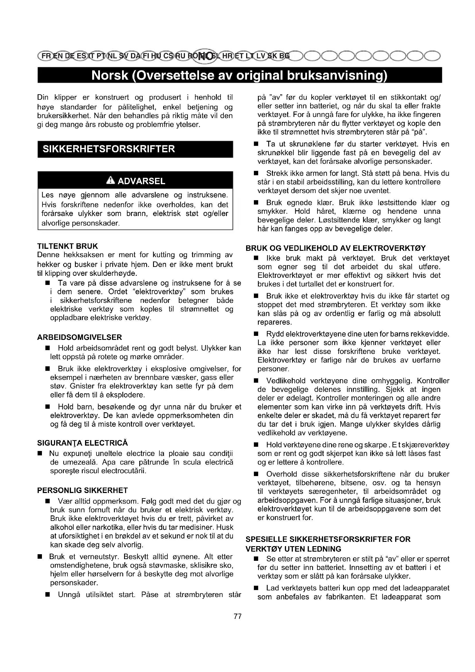 FR EN DE ES IT PT NL SV DA FI HU CS RU RO PL SL HR ET LT LV SK BG Din klipper er konstruert og produsert i henhold til høye standarder for pålitelighet, enkel betjening og brukersikkerhet. Når den behandles på riktig måte vil den gi deg mange års robuste og problemfrie ytelser. SIKKERHETSFORSKRIFTER ADVARSEL Les nøye gjennom alle advarslene og instruksene. Hvis forskriftene nedenfor ikke overholdes, kan det forårsake ulykker som brann, elektrisk støt og/eller alvorlige personskader. TILTENKT BRUK Denne hekksaksen er ment for kutting og trimming av hekker og busker i private hjem. Den er ikke ment brukt til klipping over skulderhøyde. Ta vare på disse advarslene og instruksene for å se i dem senere. Ordet “elektroverktøy” som brukes i sikkerhetsforskriftene nedenfor betegner både elektriske verktøy som koples til strømnettet og oppladbare elektriske verktøy. ARBEIDSOMGIVELSER Hold arbeidsområdet rent og godt belyst. Ulykker kan lett oppstå på rotete og mørke områder. Bruk ikke elektroverktøy i eksplosive omgivelser, for eksempel i nærheten av brennbare væsker, gass eller støv. Gnister fra elektroverktøy kan sette fyr på dem eller få dem til å eksplodere. Hold barn, besøkende og dyr unna når du bruker et elektroverktøy. De kan avlede oppmerksomheten din og få deg til å miste kontroll over verktøyet.