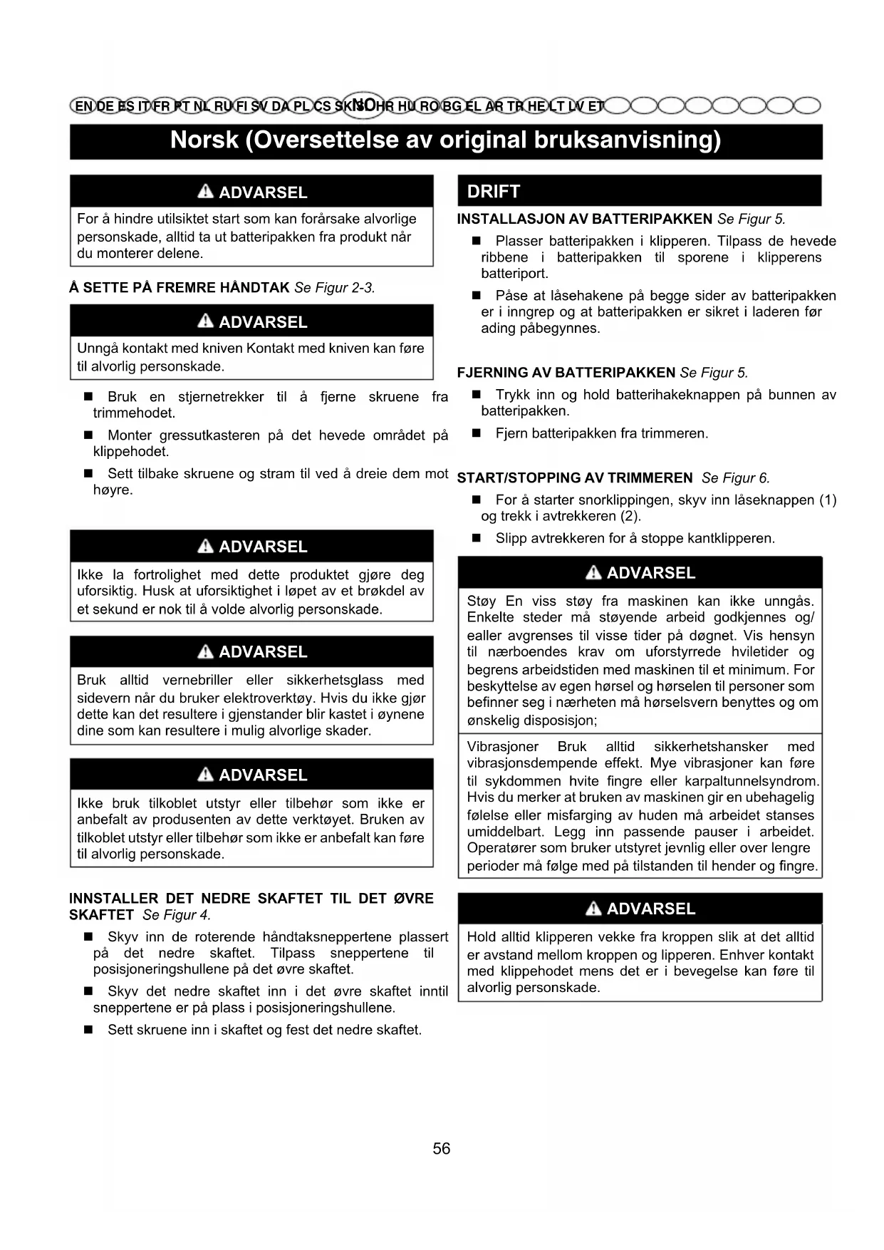EN DE ES IT FR PT NL RU FI SV DA PL CS SK SL HR HU RO BG EL AR TR HE LT LV ET ADVARSEL For å hindre utilsiktet start som kan forårsake alvorlige personskade, alltid ta ut batteripakken fra produkt når du monterer delene. Å SETTE PÅ FREMRE HÅNDTAK Se Figur 2-3. ADVARSEL Unngå kontakt med kniven Kontakt med kniven kan føre til alvorlig personskade. Bruk en stjernetrekker til å fjerne skruene fra trimmehodet. Monter gressutkasteren på det hevede området på klippehodet. Sett tilbake skruene og stram til ved å dreie dem mot høyre. ADVARSEL Ikke la fortrolighet med dette produktet gjøre deg uforsiktig. Husk at uforsiktighet i løpet av et brøkdel av et sekund er nok til å volde alvorlig personskade. ADVARSEL Bruk alltid vernebriller eller sikkerhetsglass med sidevern når du bruker elektroverktøy. Hvis du ikke gjør dette kan det resultere i gjenstander blir kastet i øynene dine som kan resultere i mulig alvorlige skader. ADVARSEL Ikke bruk tilkoblet utstyr eller tilbehør som ikke er anbefalt av produsenten av dette verktøyet. Bruken av tilkoblet utstyr eller tilbehør som ikke er anbefalt kan føre til alvorlig personskade. INNSTALLER DET NEDRE SKAFTET TIL DET ØVRE SKAFTET Se Figur 4. Skyv inn de roterende håndtaksneppertene plassert på det nedre skaftet. Tilpass sneppertene til posisjoneringshullene på det øvre skaftet. Skyv det nedre skaftet inn i det øvre skaftet inntil sneppertene er på plass i posisjoneringshullene. Sett skruene inn i skaftet og fest det nedre skaftet. DRIFT INSTALLASJON AV BATTERIPAKKEN Se Figur 5. Plasser batteripakken i klipperen. Tilpass de hevede ribbene i batteripakken til sporene i klipperens batteriport. Påse at låsehakene på begge sider av batteripakken er i inngrep og at batteripakken er sikret i laderen før ading påbegynnes. FJERNING AV BATTERIPAKKEN Se Figur 5. Trykk inn og hold batterihakeknappen på bunnen av batteripakken. Fjern batteripakken fra trimmeren. START/STOPPING AV TRIMMEREN Se Figur 6. For å starter snorklippingen, skyv inn låseknappen (1) og trekk i avtrekkeren (2). Slipp avtrekkeren for å stoppe kantklipperen. ADVARSEL Støy En viss støy fra maskinen kan ikke unngås. Enkelte steder må støyende arbeid godkjennes og/ ealler avgrenses til visse tider på døgnet. Vis hensyn til nærboendes krav om uforstyrrede hviletider og begrens arbeidstiden med maskinen til et minimum. For beskyttelse av egen hørsel og hørselen til personer som benner seg i nærheten må hørselsvern benyttes og om ønskelig disposisjon; Vibrasjoner Bruk alltid sikkerhetshansker med vibrasjonsdempende effekt. Mye vibrasjoner kan føre til sykdommen hvite ngre eller karpaltunnelsyndrom. Hvis du merker at bruken av maskinen gir en ubehagelig følelse eller misfarging av huden må arbeidet stanses umiddelbart. Legg inn passende pauser i arbeidet. Operatører som bruker utstyret jevnlig eller over lengre perioder må følge med på tilstanden til hender og ngre. ADVARSEL Hold alltid klipperen vekke fra kroppen slik at det alltid er avstand mellom kroppen og lipperen. Enhver kontakt med klippehodet mens det er i bevegelse kan føre til alvorlig personskade. 56Norsk (Oversettelse av original bruksanvisning)