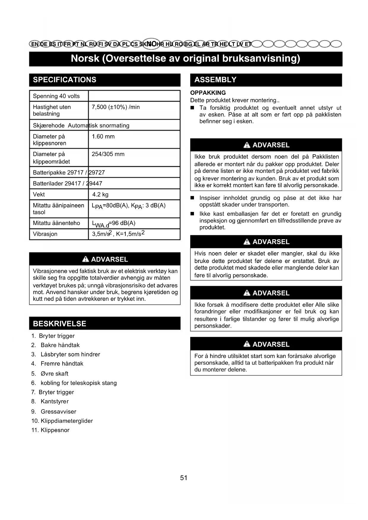 ASSEMBLY OPPAKKING Dette produktet krever montering.. Ta forsiktig produktet og eventuelt annet utstyr ut av esken. Påse at alt som er ført opp på pakklisten befinner seg i esken. ADVARSEL Ikke bruk produktet dersom noen del på Pakklisten allerede er montert når du pakker opp produktet. Deler på denne listen er ikke montert på produktet ved fabrikk og krever montering av kunden. Bruk av et produkt som ikke er korrekt montert kan føre til alvorlig personskade. Inspiser innholdet grundig og påse at det ikke har oppstått skader under transporten. Ikke kast emballasjen før det er foretatt en grundig inspeksjon og gjennomført en tilfredsstillende prøve av produktet. ADVARSEL Hvis noen deler er skadet eller mangler, skal du ikke bruke dette produktet før delene er erstattet. Bruk av dette produktet med skadede eller manglende deler kan føre til alvorlig personskade. ADVARSEL Ikke forsøk å modisere dette produktet eller Alle slike forandringer eller modikasjoner er feil bruk og kan resultere i farlige tilstander og fører til mulig alvorlige personskader. ADVARSEL For å hindre utilsiktet start som kan forårsake alvorlige personskade, alltid ta ut batteripakken fra produkt når du monterer delene. 51Norsk (Oversettelse av original bruksanvisning)