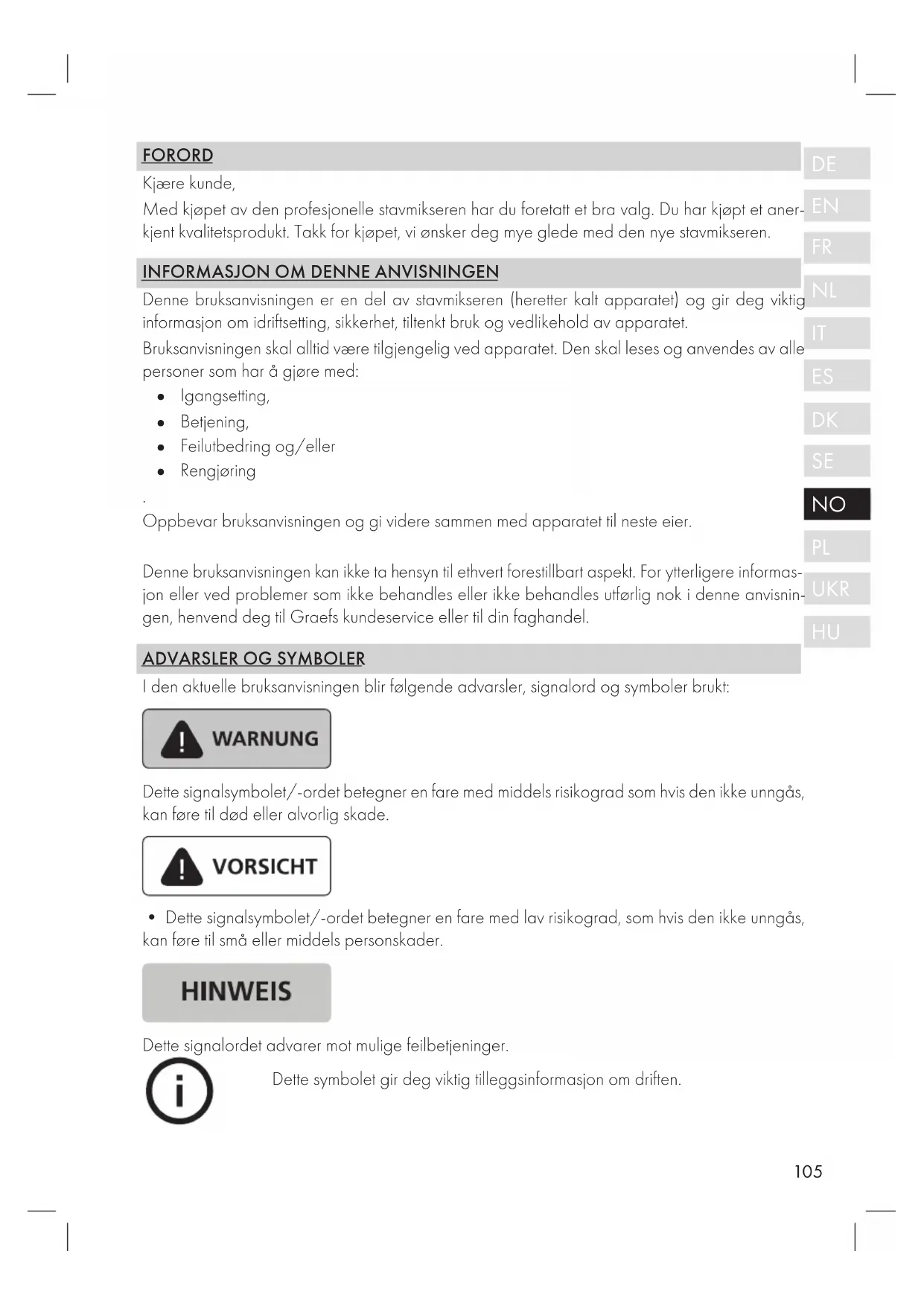 - Dette signalsymbolet/-ordet betegner en fare med lav risikograd, som hvis den ikke unngås, kan føre til små eller middels personskader. Dette signalordet advarer mot mulige feilbetjeninger. Dette symbolet gir deg viktig tilleggsinformasjon om driften.106 GENERELLE SIKKERHETSINSTRUKSER Dette apparatet oppfyller de foreskrevne sikkerhetsbestemmelsene. Usak- kyndig bruk kan likevel føre til personskader og materielle skader. Overhold følgende sikkerhetsanvisninger for en sikker omgang med ap- paratet: ● Kontroller apparatet for ytre synlige skader på hus, strømledning og -støpsel før bruk. Ta aldri et skadet apparat i bruk. ● Reparasjoner må bare utføres av en fagperson eller av Graefs kunde- service. Feilaktige reparasjoner kan utsette brukeren for store farer. I tillegg ugyldiggjøres krav på garantiytelser. ● Defekte komponenter skal kun skiftes ut med originale reservedeler. Kun med disse delene kan det garanteres at sikkerhetskravene oppfylles. ● Dette apparatet kan også brukes av barn fra 8 år og av personer med reduserte fysiske, sensoriske eller mentale evner eller med mangel på erfaring og/eller kunnskap, hvis de holdes under tilsyn eller har blitt opplært i sikker bruk av apparatet og forstår de farene som oppstår derav. Rengjøring og vedlikehold må ikke utføres av barn, med mindre de er eldre enn 8 år og under tilsyn. ● Apparatet og apparatets strømledning må holdes unna barn under 8 år. ● Barn skal holdes under tilsyn for å sikre at de ikke leker med apparatet. ● Apparatet er ikke beregnet til bruk med et eksternt tidsur eller en separat fjernkontroll. ● Strømledningen skal alltid trekkes ut fra stikkontakten etter støpselet, ikke etter strømledningen. ● Ikke bruk apparatet hvis strømledningen eller støpselet er skadet. ● Forhindre at det kommer væske på støpselet. ● Hvis tilkoblingsledningen er skadet, skal den, for å unngå farer, kun skif- tes ut av produsenten, kundeservice eller en lignende kvalifisert person. ● Huset på apparatet må ikke under noen omstendigheter åpnes. Hvis spenningsførende tilkoblinger berøres og den elektriske og mekaniske oppbygningen forandres, er det fare for elektrisk støt.107