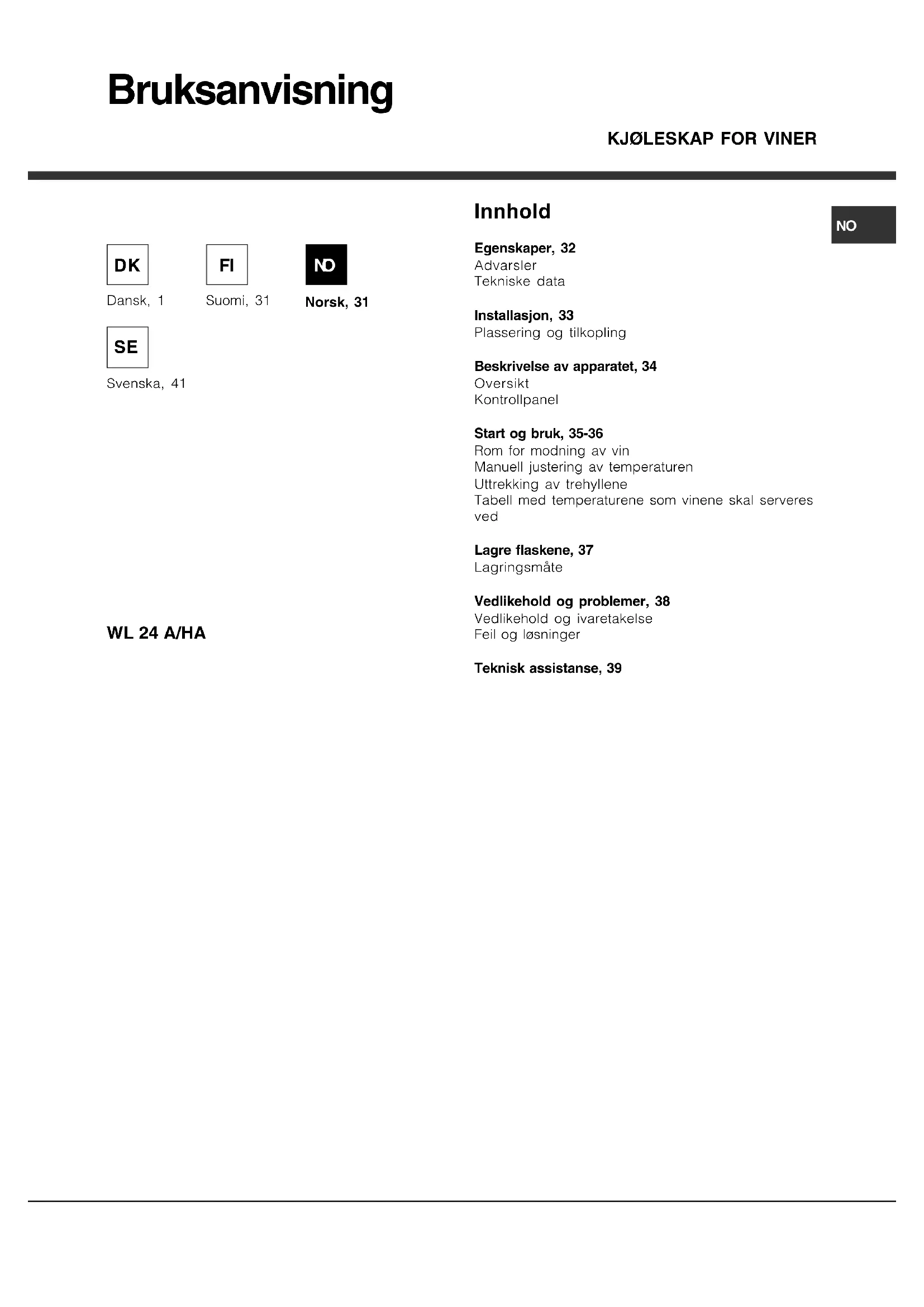 195092482.01 - B 08/2012NO STEKEOVN Innhold Egenskaper, 32 Advarsler Tekniske data Installasjon, 33 Plassering og tilkopling Beskrivelse av apparatet, 34 Oversikt Kontrollpanel Start og bruk, 35-36 Rom for modning av vin Manuell justering av temperaturen Uttrekking av trehyllene Tabell med temperaturene som vinene skal serveres ved Lagre flaskene, 37 Lagringsmåte Vedlikehold og problemer, 38 Vedlikehold og ivaretakelse Feil og løsninger Teknisk assistanse, 39 Bruksanvisning