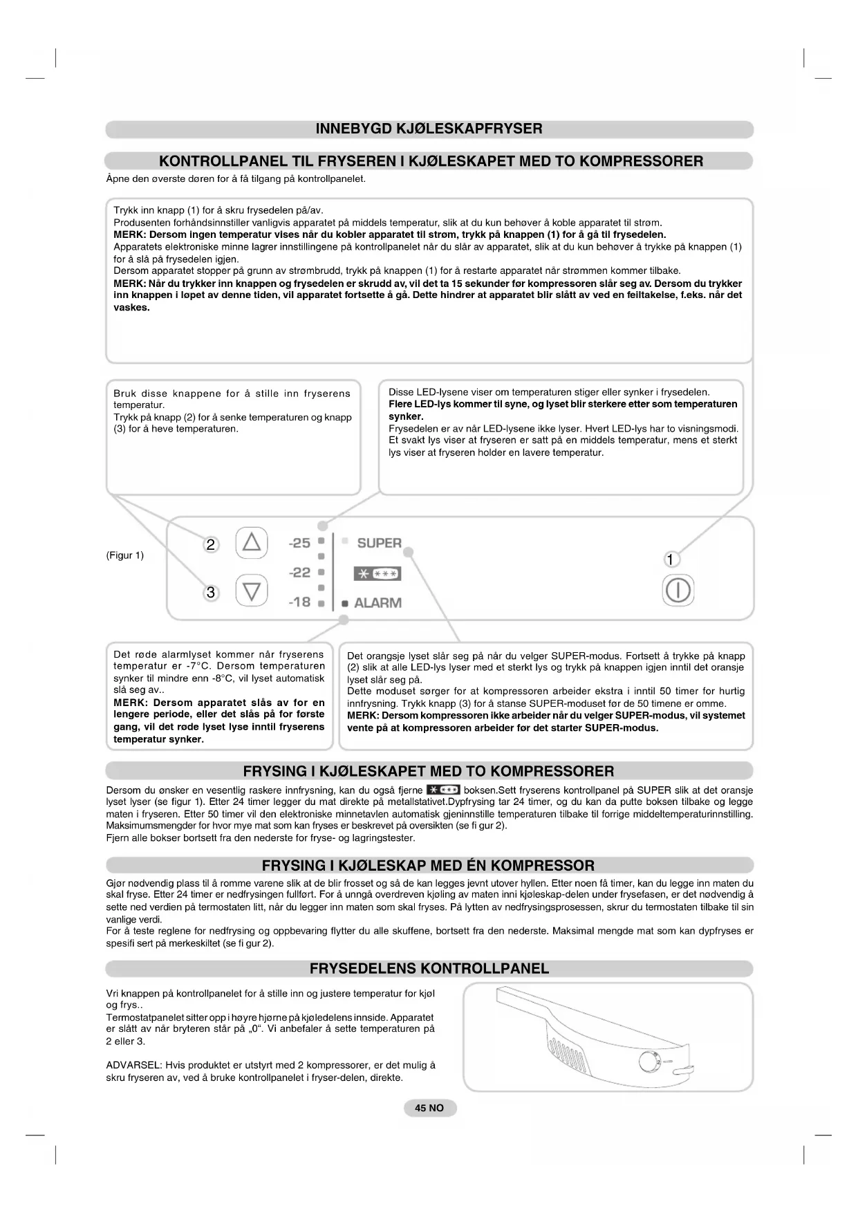 FRYSING I KJØLESKAPET MED TO KOMPRESSORER Dersom du ønsker en vesentlig raskere innfrysning, kan du også fjerne boksen.Sett fryserens kontrollpanel på SUPER slik at det oransje lyset lyser (se fi gur 1). Etter 24 timer legger du mat direkte på metallstativet.Dypfrysing tar 24 timer, og du kan da putte boksen tilbake og legge maten i fryseren. Etter 50 timer vil den elektroniske minnetavlen automatisk gjeninnstille temperaturen tilbake til forrige middeltemperaturinnstilling. Maksimumsmengder for hvor mye mat som kan fryses er beskrevet på oversikten (se fi gur 2). Fjern alle bokser bortsett fra den nederste for fryse- og lagringstester. FRYSEDELENS KONTROLLPANEL Vri knappen på kontrollpanelet for å stille inn og justere temperatur for kjøl og frys.. Termostatpanelet sitter opp i høyre hjørne på kjøledelens innside. Apparatet er slått av når bryteren står på „0“. Vi anbefaler å sette temperaturen på 2 eller 3. ADVARSEL: Hvis produktet er utstyrt med 2 kompressorer, er det mulig å skru fryseren av, ved å bruke kontrollpanelet i fryser-delen, direkte. Bruk disse knappene for å stille inn fryserens temperatur. Trykk på knapp (2) for å senke temperaturen og knapp (3) for å heve temperaturen. Det røde alarmlyset kommer når fryserens temperatur er -7°C. Dersom temperaturen synker til mindre enn -8°C, vil lyset automatisk slå seg av.. MERK: Dersom apparatet slås av for en lengere periode, eller det slås på for første gang, vil det røde lyset lyse inntil fryserens temperatur synker. Det orangsje lyset slår seg på når du velger SUPER-modus. Fortsett å trykke på knapp (2) slik at alle LED-lys lyser med et sterkt lys og trykk på knappen igjen inntil det oransje lyset slår seg på. Dette moduset sørger for at kompressoren arbeider ekstra i inntil 50 timer for hurtig innfrysning. Trykk knapp (3) for å stanse SUPER-moduset før de 50 timene er omme. MERK: Dersom kompressoren ikke arbeider når du velger SUPER-modus, vil systemet vente på at kompressoren arbeider før det starter SUPER-modus. 45 NO Disse LED-lysene viser om temperaturen stiger eller synker i frysedelen. Flere LED-lys kommer til syne, og lyset blir sterkere etter som temperaturen synker. Frysedelen er av når LED-lysene ikke lyser. Hvert LED-lys har to visningsmodi. Et svakt lys viser at fryseren er satt på en middels temperatur, mens et sterkt lys viser at fryseren holder en lavere temperatur. Trykk inn knapp (1) for å skru frysedelen på/av. Produsenten forhåndsinnstiller vanligvis apparatet på middels temperatur, slik at du kun behøver å koble apparatet til strøm. MERK: Dersom ingen temperatur vises når du kobler apparatet til strøm, trykk på knappen (1) for å gå til frysedelen. Apparatets elektroniske minne lagrer innstillingene på kontrollpanelet når du slår av apparatet, slik at du kun behøver å trykke på knappen (1) for å slå på frysedelen igjen. Dersom apparatet stopper på grunn av strømbrudd, trykk på knappen (1) for å restarte apparatet når strømmen kommer tilbake. MERK: Når du trykker inn knappen og frysedelen er skrudd av, vil det ta 15 sekunder før kompressoren slår seg av. Dersom du trykker inn knappen i løpet av denne tiden, vil apparatet fortsette å gå. Dette hindrer at apparatet blir slått av ved en feiltakelse, f.eks. når det vaskes.