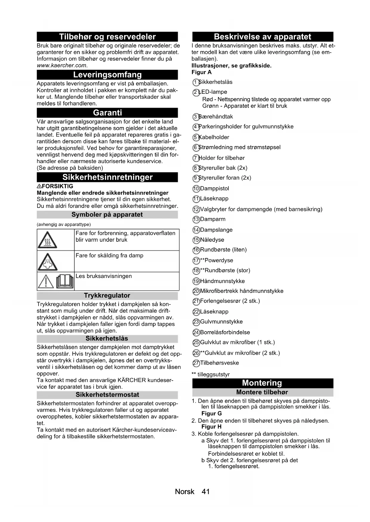 pes og overflatene tørkes med denne. Glassrengjøring OBS Glass-sprekker og skadet overflate Damp kan skade forseglede steder på vindusrammen og føre til spenning i overflaten på vindusruten når det er lave temperaturer ute. Det kan føre til at glasset sprekker. Ikke rett dampen mot forseglede steder på vindusram- men. Varm opp vindusruten når temperaturen ute er lav ved å dampe hele glassflaten lett. Rengjør vindusflaten med håndmunnstykket og overtrekket. For å trekke vannet av, bruk en vindus- nal eller tørk flatene tørre. Bruk af tilbehør Damppistol Damppistolen kan brukes for følgende bruksområder uten tilbehør: Fjerning av lette krøller eller bretter fra hengende klesplagg: Damp klesplagget fra 10-20 cm avstand. For våt støvtørking: Damp en klut raskt og tørk over møblene med den. Nåledyse Nåledysen er egnet for rengjøring av steder som det er vanskelig å komme til, fuger, armaturer, avløp, vasker, toaletter, sjalusier eller varmeapparater. Jo nærmere nåledysen er til det skitne stedet, desto større blir ren- gjøringseffekten, siden temperaturen og dampmengden er høyest ved dyseutløpet. Kraftige kalkavleiringer kan behandles med et egnet rengjøringsmiddel før dam- prengjøringen. La rengjøringsmiddelet virke i ca. 5 mi- nutter og damprengjør deretter.