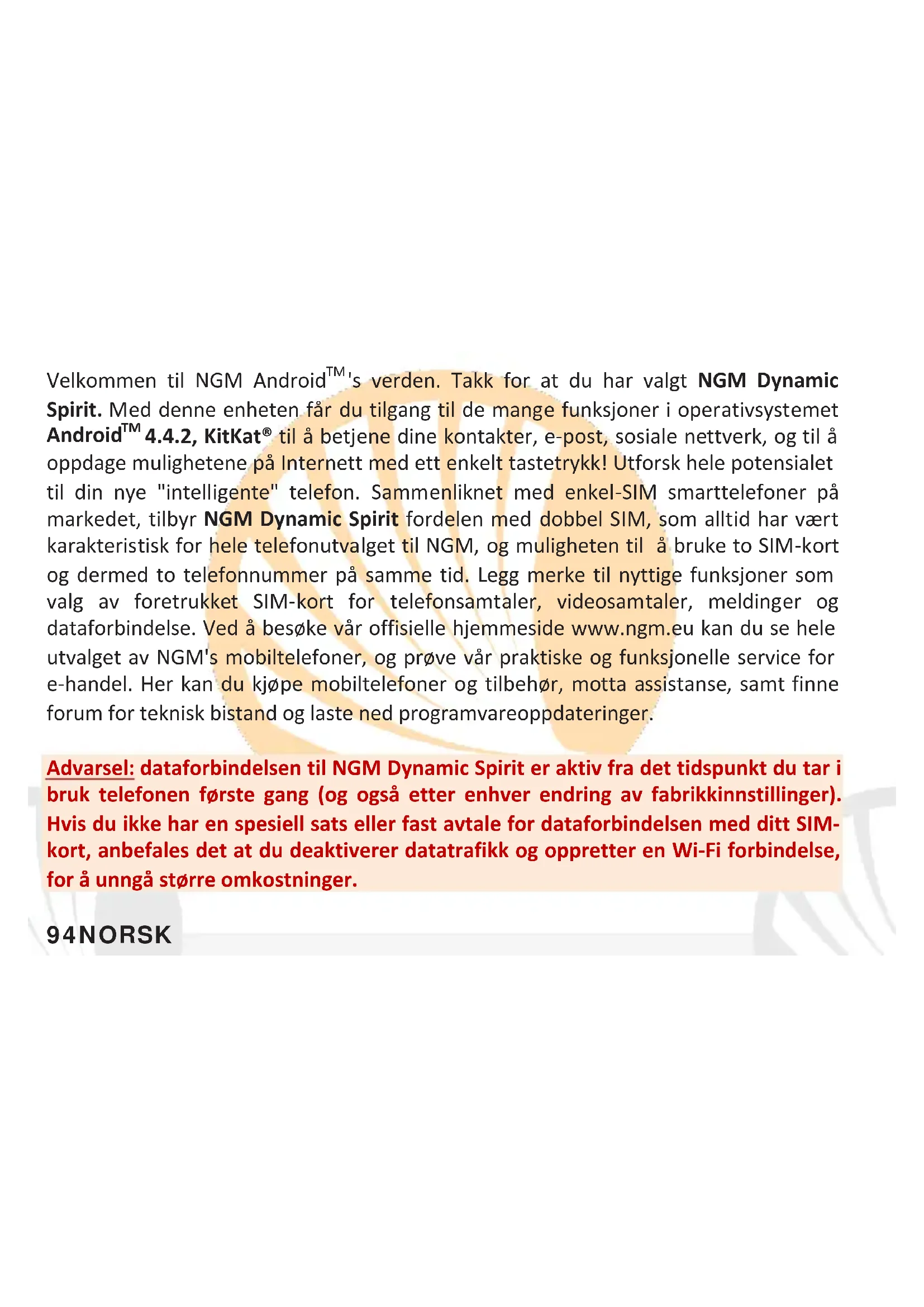 Merk: Fra Kontekstmenyen i Kontakter har du tilgang til alle funksjoner for å legge til/fjerne kontakter og en rekke andre nyttige innstillinger.105NORSK Legge inn ringetoner Velg fra Hovedmenyen Innstillinger > Lydprofiler > Generelt. Velg Ringetone for taleanrop > SIM-kort 1 eller SIM-kort 2 og velg ønsket ringetone for hvert SIM-kort. Hvis du ønsker å sette inn en egendefinert ringetone: velger du i Musikk det lydklipp du ønsker ved å trykke lenge på og velge Bruk som ringetone i Kontekstmenyen. Slik blir lydfilen lagt til i listen over tilgjengelige ringetoner. Aktivere eller deaktivere vibrasjon hurtig: for raskt å slå av ringetonen for samtaler og meldinger, trykk på volumknappen "-". ved nådd minimumsvolum, vil telefonen gå inn i vibrasjonsmodus. Ved å trykke på volum “–“ på nytt, går telefonen over i stillemodus. Sende og lese SMS og MMS Lese SMS og MMS: når du mottar en SMS eller MMS, vises et ikon i varselpanelet. Hvis du klikker på ikonet, er det mulig å gå direkte inn og lese den mottatte meldingen. Innkommende meldinger kan ses både på Startskjermen og på menyen ved å velge Meldinger. Sende SMS og MMS: fra startsiden eller hovedmenyen velger du Meldinger og deretter ikonet nederst. Skriv inn de første bokstavene i et navn i mottakerfeltet for å søke en kontakt og velg denne fra pop-up lenken, eller skriv inn nummeret til mottaker direkte, alternativt velg ved feltet og finn mottaker/e . Skriv inn teksten med det virtuelle tastaturet. Velg “+” for å inkludere multimediavedlegg (melding blir konvertert til MMS) trykk og velg ønsket SIM-kort. Merk: det er mulig å bruke følgende filformat som ringetoner *mid,*wav,*ogg og *mp3.106 NORSK TILKOBLING: for å utnytte bedre potensialet til terminalen og operativsystemet er det nødvendig å ha en aktiv dataforbindelse; Dataforbindelsen til NGM Dynamic Spirit er aktiv fra det øyeblikk du første gang slår på telefonen. Hvis det ikke er oppgitt annet i abonnementet, medfører datatrafikken kostnader; vi anbefaler derfor å konfigurere Internettilgangen via WiFi. For å aktivere datatrafikk på et av SIM-kortene velger du Innstillinger > Betjene SIM-kort > Dataforbindelse, eller aktiver den med knappen for hurtiginnstillinger i varselpanelet. Opprette Internettforbindelse via WiFi®: du kan koble til WLAN-nettverk ved å bruke WiFi- funksjonen. For å aktivere den, velges fra Hovedmenyen Innstillinger > WiFi. Ta hensyn til alle advarsler og retningslinjer fra autorisert personell når du befinner deg i områder der bruk av trådløse enheter er begrenset (fly, sykehus, o.l.). Bruk avslått modus når du bruker tjenester som ikke krever nettilgang. Koble til enheten Bluetooth®: slå på Bluetooth-enheten du vil koble til. Se dokumentasjonen for enheten. Velg fra hovedmenyen Innstillinger > Bluetooth på/av for å aktivere Bluetooth. På Tilpasningsmenyen finner du flere funksjoner og innstillinger. Velg Søk enheter for å starte automatisk søk etter Bluetooth-enheter. Blant de oppdagede enheter, velger du navnet på enheten som skal knyttes til. Telefonen vil prøve å koble på enheten, eventuelt blir det bedt om å oppgi en kode.107NORSK Koble til Internett: fra hovedmenyen velges Nettleser. Tast inn nettadressen URL i adressefeltet for å starte å navigere. Hvis du velger å navigere med dataforbindelse på telefonnettet, undersøk kostnader eller velg et abonnement med med fast pris på dataflyt med din operatør. Et alternativ er å bruke WiFi forbindelsen (se punkt om “Tilkobling”). Konfigurering av Gmail-konto: for å utnytte mulighetene i systemet AndroidTM bedre, må du konfigurere en ny Gmail-konto, eller oppgi en eksisterende. Dette vil gi deg tilgang til alle programmer i systemet Android