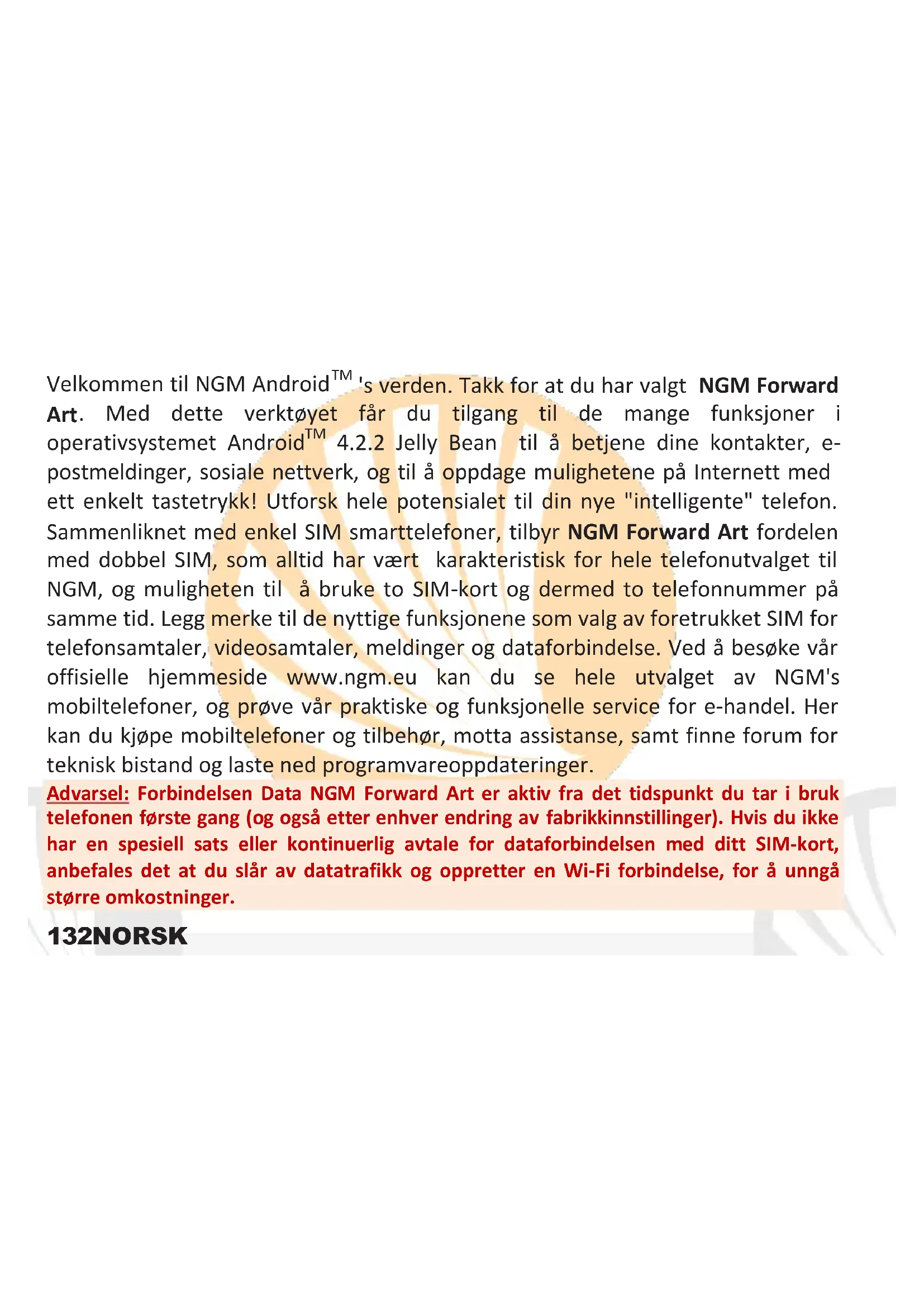 Merk: det er mulig å bruke følgende filformat som ringetoner *mid,*wav,*ogg og *mp3.143NORSK Legge inn SMS og MMS Lese SMS og MMS: når du mottar en ny SMS eller MMS, ser du et ikon i meldingspanelet. Hvis du klikker på ikonet er det mulig å gå direkte inn og lese den mottatte meldingen. Det er i alle tilfeller mulig å se innkomne meldinger på startskjermen eller på hovedmenyen ved å velge Meldinger. Sende SMS og MMS: fra startsiden eller hovedmenyen velger du Meldinger eller ikonet nederst. Skriv inn de første bokstavene i et navn i mottakerfeltet for å søke en kontakt og velg fra pop-up lenken eller skriv inn nummeret til mottaker direkte, eller velg ikonet Kontakter ved feltet og finn mottakere. Skriv inn teksten med det virtuelle tastaturet. Velg ikonet for å legge ved eventuelle multimedia vedlegg (meldingen blir konvertert til MMS) og trykk Send og velg ønsket SIM-kort. TILKOBLING: for å utnytte bedre potensialet til terminalen og operativsystemet er det nødvendig å ha en aktiv dataforbindelse; dataforbindelsen til NGM Forward Art er aktiv fra det øyeblikk du slår på telefonen. Hvis det ikke er oppgitt i abbonnementet, innebærer datatrafikken kostnader; vi anbefaler derfor å konfigurere Internett tilgangen via WiFi. For å aktivere datatrafikk på et av SIM-kortene velger du Innstillinger > Betjene SIM > Dataforbindelse, eller aktiver den med knappen for hurtiginnstillinger i meldingspanelet.144 NORSK Koble til Internett med WiFi funksjonen®: du kan koble deg på WLAN nettet ved å bruke WiFi funksjonen. For å aktivere den fra hovedmenyen velg Innstillinger > WiFi. Ta hensyn til alle advarsler og retningslinjer fra autorisert personell når du befinner deg i områder der bruk av trådløse enheter er begrenset (fly, sykehus, o.l.). Bruk avslått modus når du bruker tjenester som ikke krever nettilgang. Koble til enheten Bluetooth®: å koble seg til enheten Bluetooth når det er ønskelig. Se dokumentasjonen for enheten. Velg fra hovedmenyen Innstillinger > Bluetooth av/på for å aktivere Bluetooth. På Tilpasningsmenyen finner du flere funksjoner og innstillinger. Velg for start av automatisk søk etter enheten Bluetooth. Velg blant de oppdagede enheter hvilken du vil koble på. Telefonen vil prøve å koble på enheten, eventuelt blir det bedt om å oppgi en kode.
