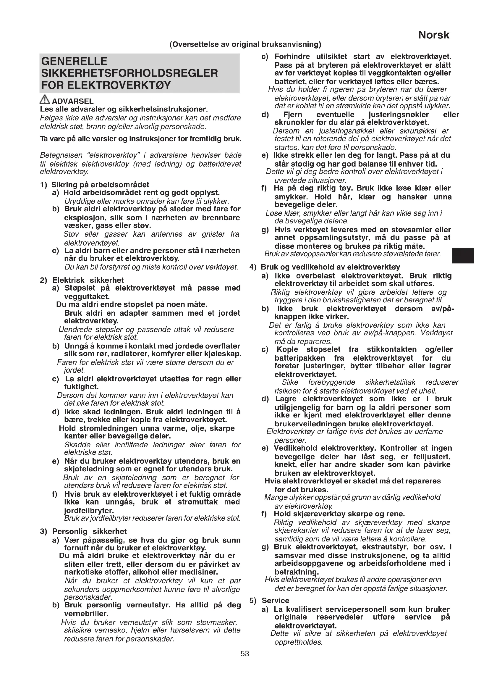 a) La kvalifi sert servicepersonell som kun bruker originale reservedeler utføre service på elektroverktøyet. Dette vil sikre at sikkerheten på elektroverktøyet opprettholdes. GENERELLE SIKKERHETSFORHOLDSREGLER