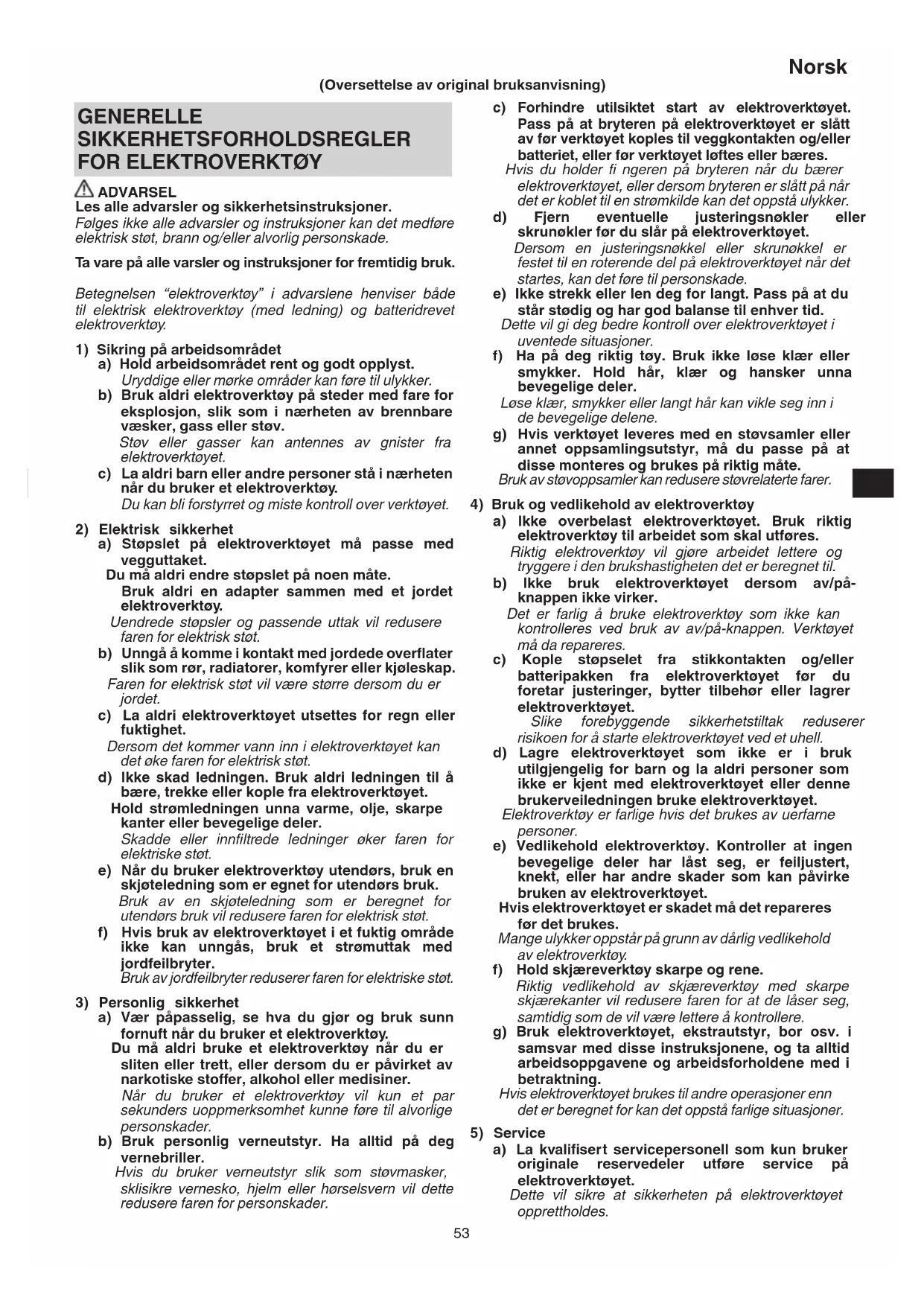 ADVARSEL Les alle advarsler og sikkerhetsinstruksjoner. Følges ikke alle advarsler og instruksjoner kan det medføre elektrisk støt, brann og/eller alvorlig personskade. Ta vare på alle varsler og instruksjoner for fremtidig bruk. Betegnelsen “elektroverktøy” i advarslene henviser både til elektrisk elektroverktøy (med ledning) og batteridrevet elektroverktøy.