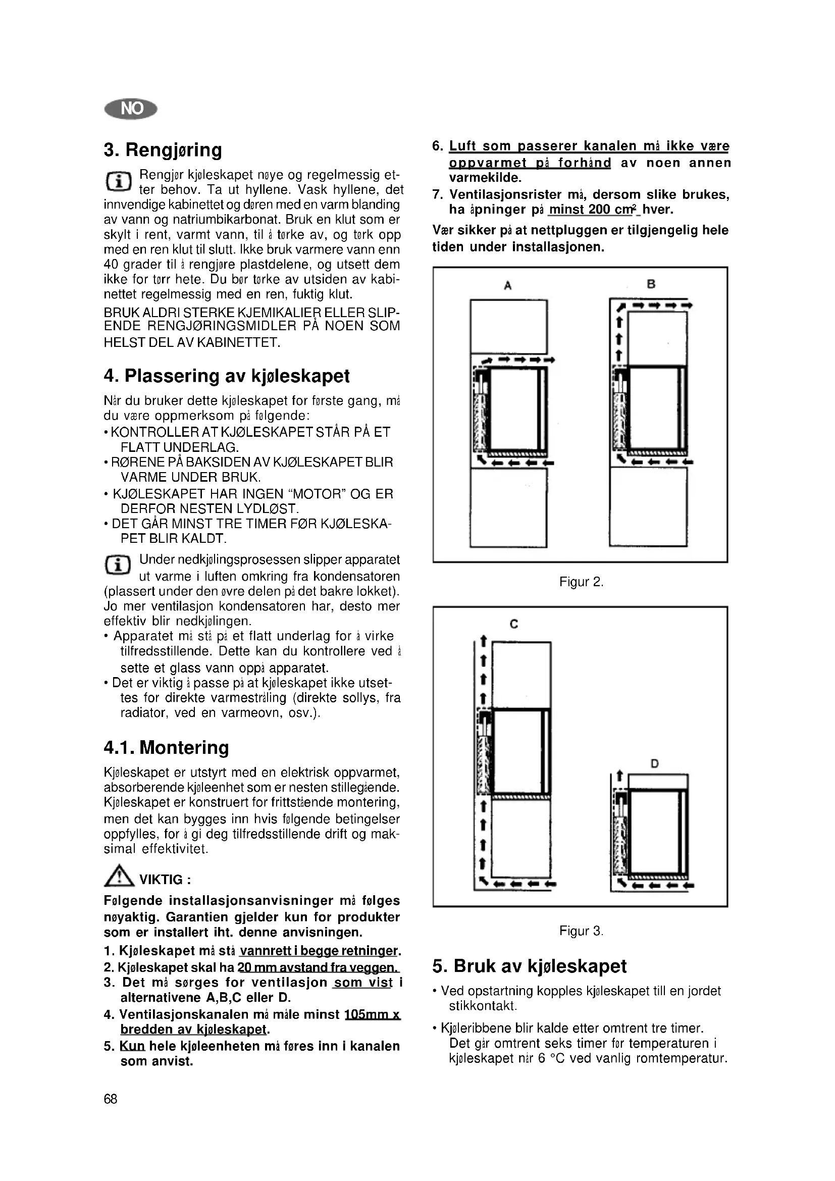 - Det er viktig å passe på at kjøleskapet ikke utset- tes for direkte varmestråling (direkte sollys, fra radiator, ved en varmeovn, osv.). 4.1. Montering Kjøleskapet er utstyrt med en elektrisk oppvarmet, absorberende kjøleenhet som er nesten stillegående. Kjøleskapet er konstruert for frittstående montering, men det kan bygges inn hvis følgende betingelser oppfylles, for å gi deg tilfredsstillende drift og mak- simal effektivitet. VIKTIG : Følgende installasjonsanvisninger må følges nøyaktig. Garantien gjelder kun for produkter som er installert iht. denne anvisningen.
