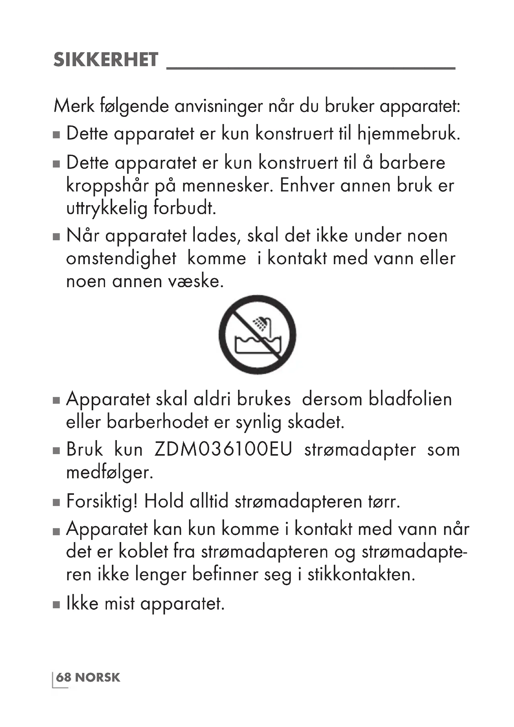 Apparatet kan kun komme i kontakt med vann når det er koblet fra strømadapteren og strømadapte- ren ikke lenger befinner seg i stikkontakten.