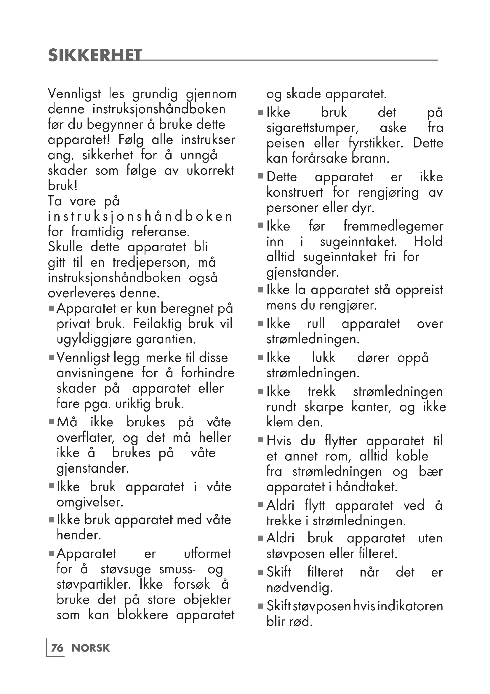 SIKKERHET Vennligst les grundig gjennom denne instruksjonshåndboken før du begynner å bruke dette apparatet! Følg alle instrukser ang. sikkerhet for å unngå skader som følge av ukorrekt bruk! Ta vare på instruksjonshåndboken for framtidig referanse. Skulle dette apparatet bli gitt til en tredjeperson, må instruksjonshåndboken også overleveres denne.