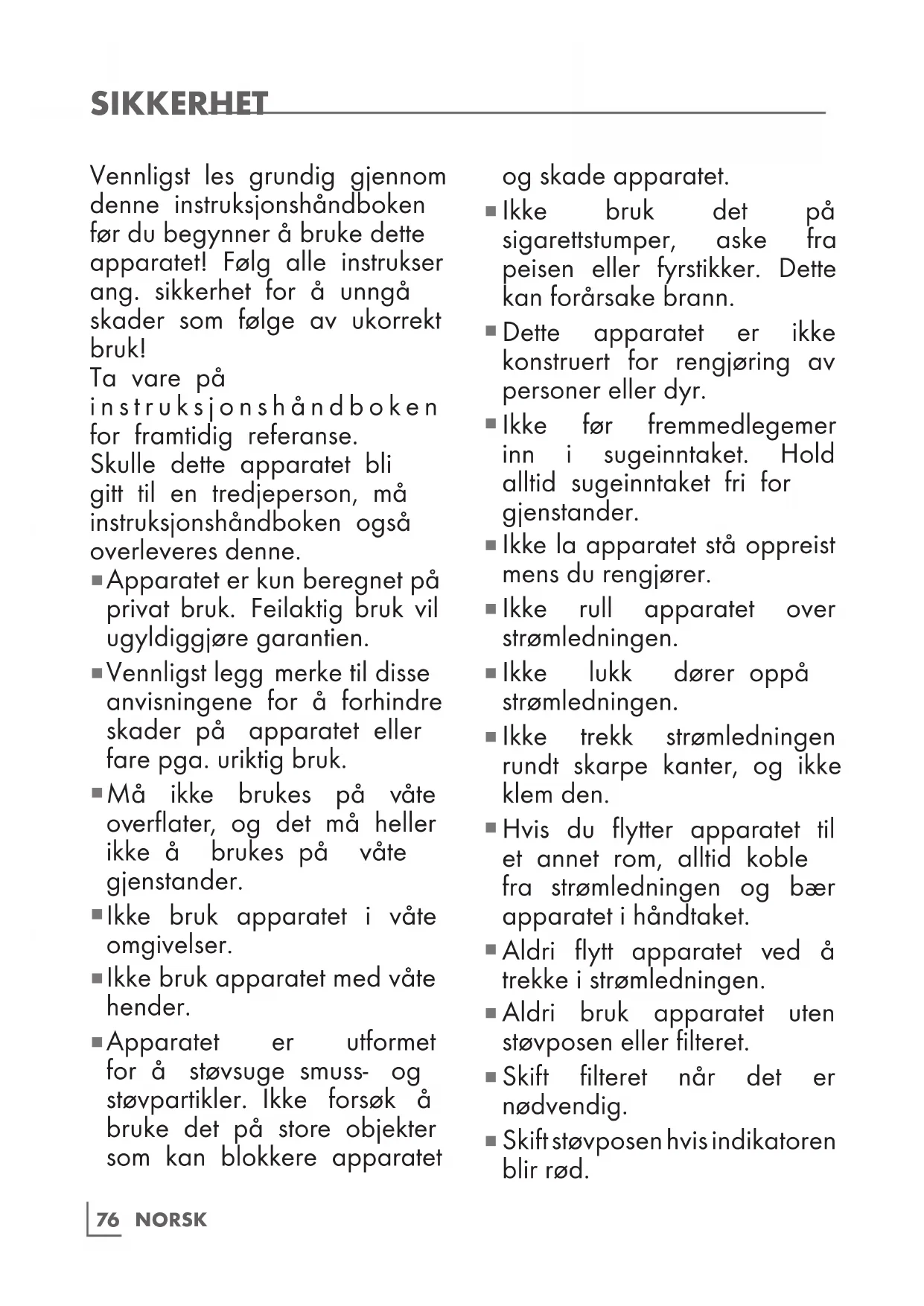 SIKKERHET Vennligst les grundig gjennom denne instruksjonshåndboken før du begynner å bruke dette apparatet! Følg alle instrukser ang. sikkerhet for å unngå skader som følge av ukorrekt bruk! Ta vare på instruksjonshåndboken for framtidig referanse. Skulle dette apparatet bli gitt til en tredjeperson, må instruksjonshåndboken også overleveres denne.