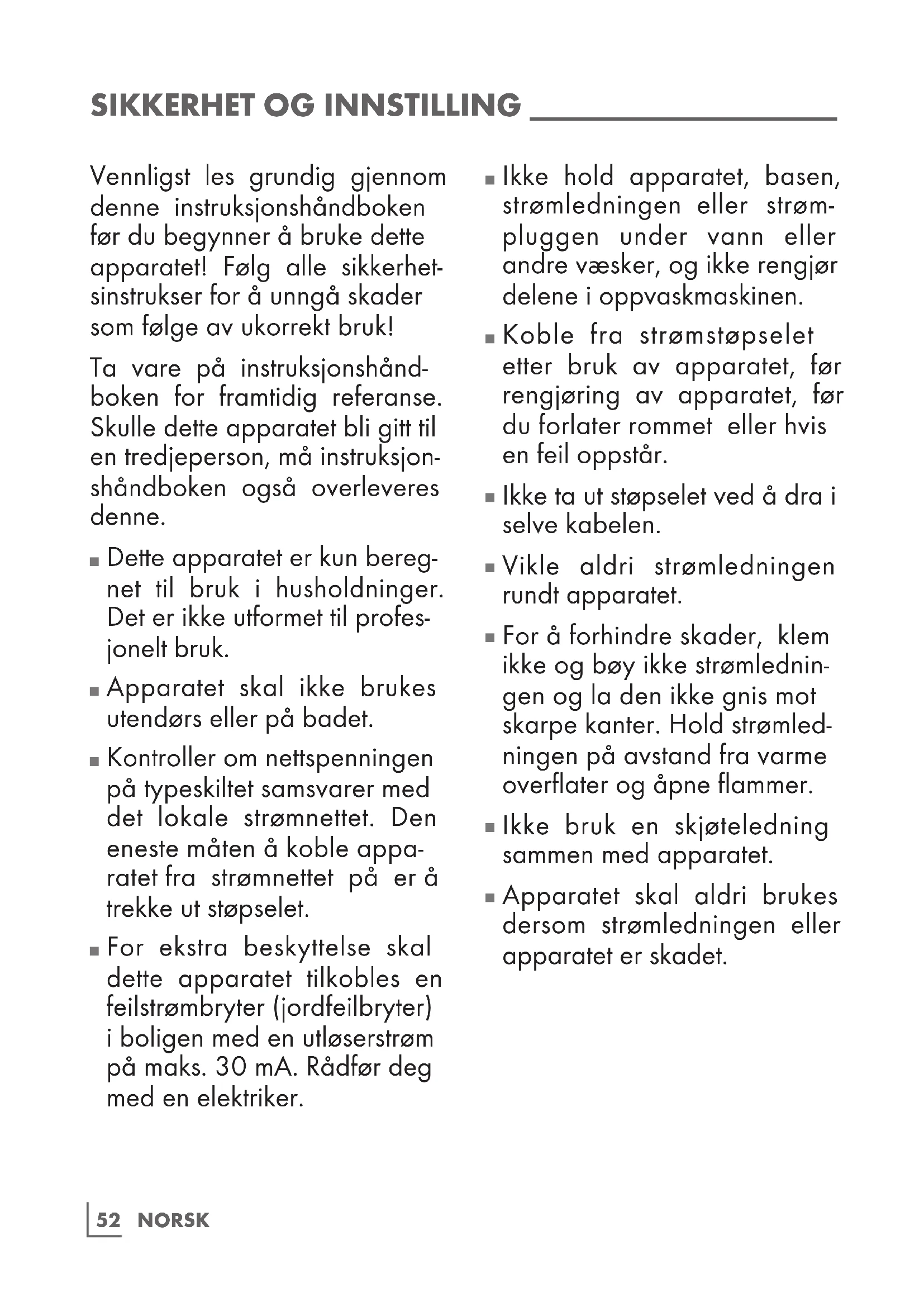 Vennligst les grundig gjennom denne instruksjonshåndboken før du begynner å bruke dette apparatet! Følg alle sikkerhet- sinstrukser for å unngå skader som følge av ukorrekt bruk! Ta vare på instruksjonshånd- boken for framtidig referanse. Skulle dette apparatet bli gitt til en tredjeperson, må instruksjon- shåndboken også overleveres denne.