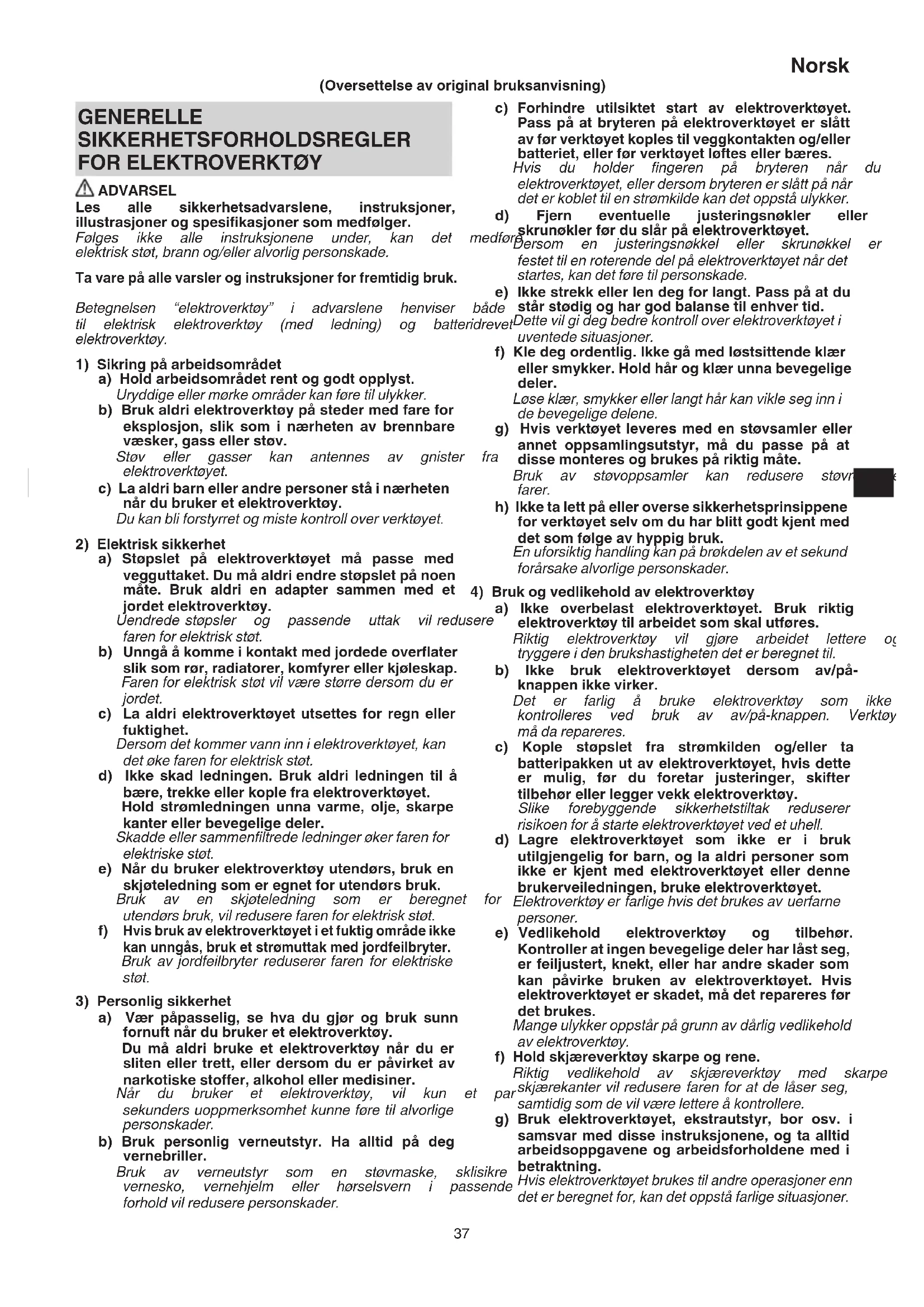 Betegnelsen “elektroverktøy” i advarslene henviser til elektrisk elektroverktøy (med ledning) og batt elektroverktøy.