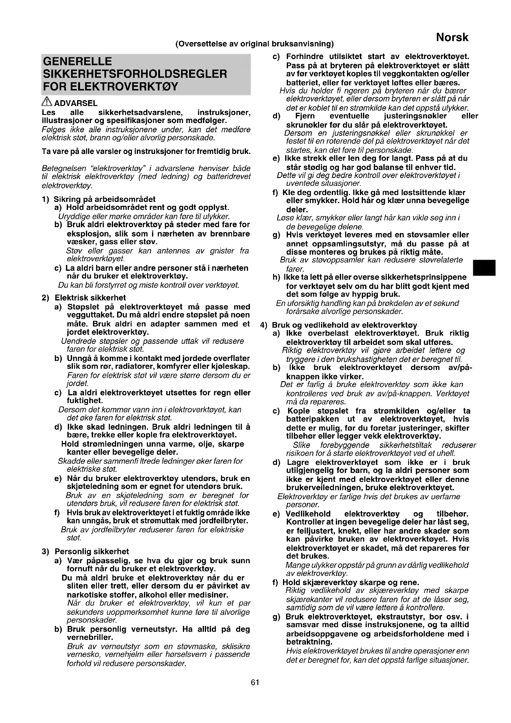 a) Ikke overbelast elektroverktøyet. Bruk riktig elektroverktøy til arbeidet som skal utføres. Riktig elektroverktøy vil gjøre arbeidet lettere og tryggere i den brukshastigheten det er beregnet til. b) Ikke bruk elektroverktøyet dersom av/på- knappen ikke virker. Det er farlig å bruke elektroverktøy som ikke kan kontrolleres ved bruk av av/på-knappen. Verktøyet må da repareres. c) Kople støpslet fra strømkilden og/eller ta batteripakken ut av elektroverktøyet, hvis dette er mulig, før du foretar justeringer, skifter tilbehør eller legger vekk elektroverktøy. Slike forebyggende sikkerhetstiltak reduserer risikoen for å starte elektroverktøyet ved et uhell. d) Lagre elektroverktøyet som ikke er i bruk utilgjengelig for barn, og la aldri personer som ikke er kjent med elektroverktøyet eller denne brukerveiledningen, bruke elektroverktøyet. Elektroverktøy er farlige hvis det brukes av uerfarne personer. e) Vedlikehold elektroverktøy og tilbehør. Kontroller at ingen bevegelige deler har låst seg, er feiljustert, knekt, eller har andre skader som kan påvirke bruken av elektroverktøyet. Hvis elektroverktøyet er skadet, må det repareres før det brukes. Mange ulykker oppstår på grunn av dårlig vedlikehold av elektroverktøy. f) Hold skjæreverktøy skarpe og rene. Riktig vedlikehold av skjæreverktøy med skarpe skjærekanter vil redusere faren for at de låser seg, samtidig som de vil være lettere å kontrollere. g) Bruk elektroverktøyet, ekstrautstyr, bor osv. i samsvar med disse instruksjonene, og ta alltid arbeidsoppgavene og arbeidsforholdene med i betraktning. Hvis elektroverktøyet brukes til andre operasjoner enn det er beregnet for, kan det oppstå farlige situasjoner. GENERELLE SIKKERHETSFORHOLDSREGLER