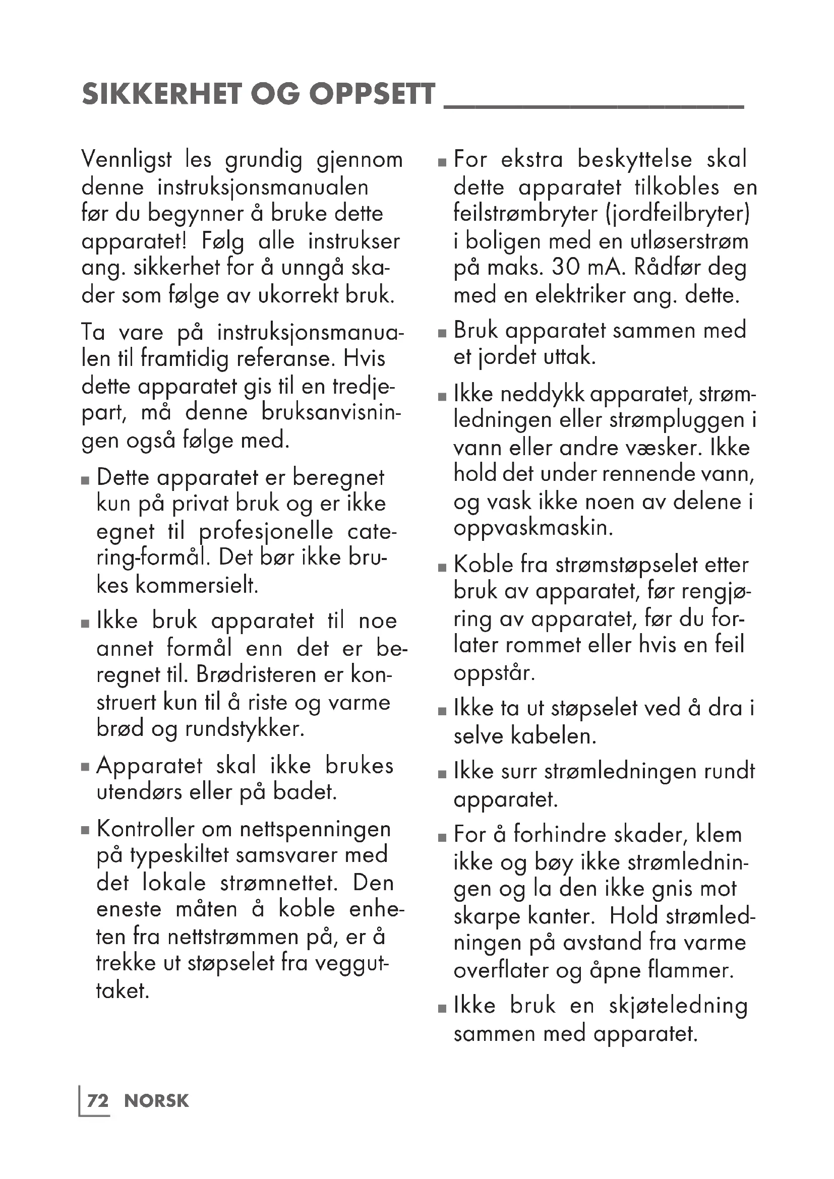 Ikke bruk apparatet til noe annet formål enn det er be- regnet til. Brødristeren er kon- struert kun til å riste og varme brød og rundstykker.