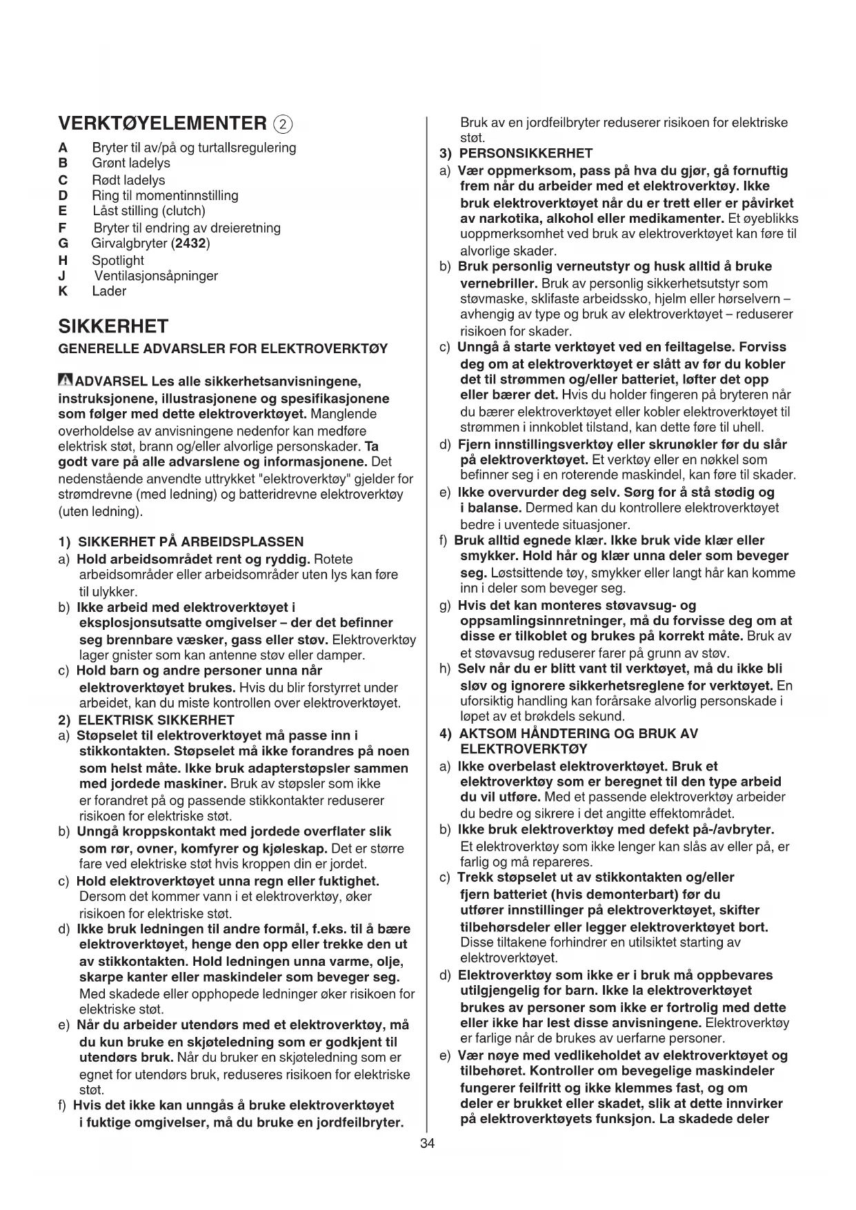 A Bryter til av/på og turtallsregulering B Grønt ladelys C Rødt ladelys D Ring til momentinnstilling E Låst stilling (clutch) F Bryter til endring av dreieretning G Girvalgbryter (2432) H Spotlight J Ventilasjonsåpninger K Lader SIKKERHET