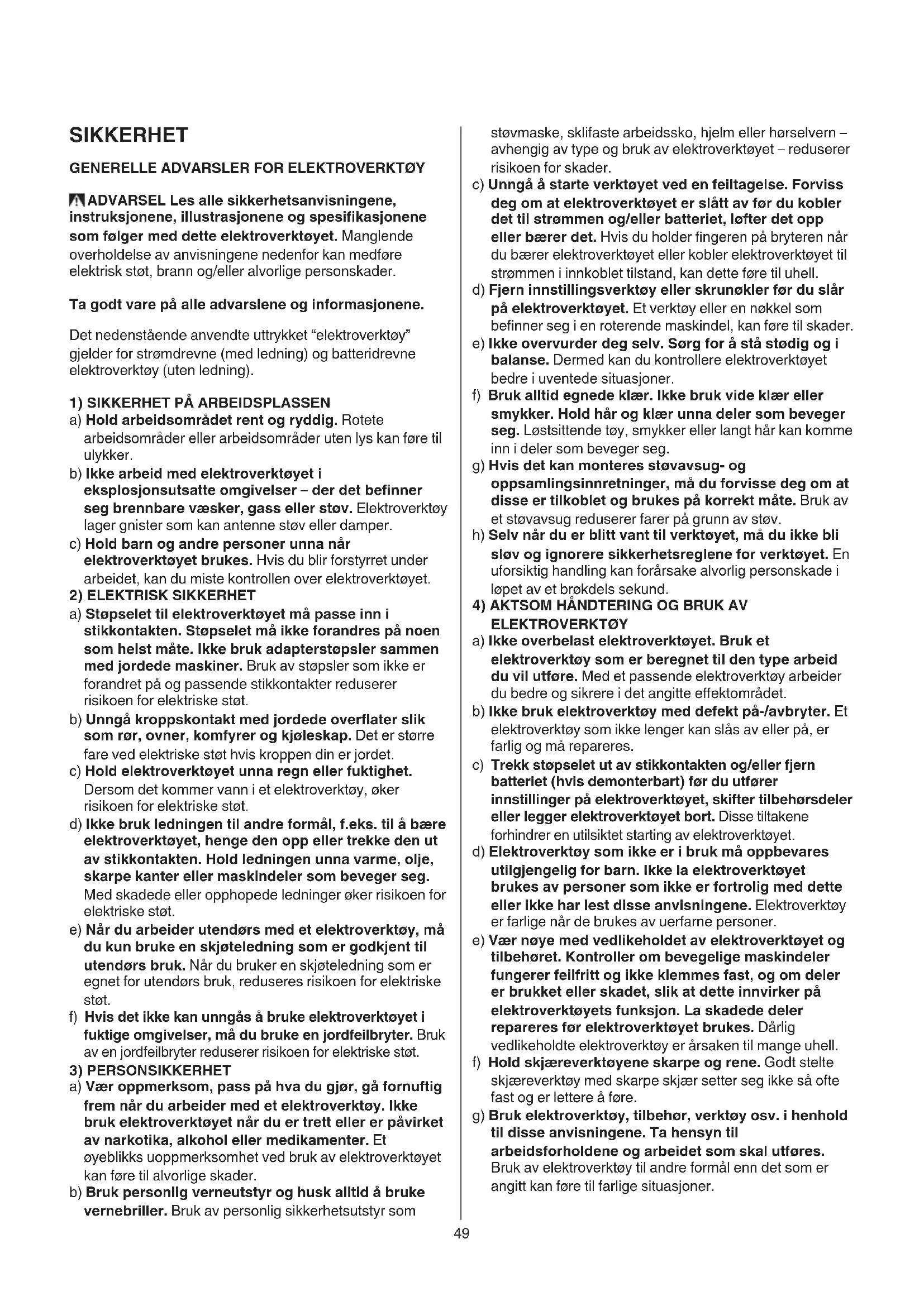 ADVARSEL Les alle sikkerhetsanvisningene, instruksjonene, illustrasjonene og spesifikasjonene som følger med dette elektroverktøyet. Manglende overholdelse av anvisningene nedenfor kan medføre elektrisk støt, brann og/eller alvorlige personskader. Ta godt vare på alle advarslene og informasjonene. Det nedenstående anvendte uttrykket “elektroverktøy” gjelder for strømdrevne (med ledning) og batteridrevne elektroverktøy (uten ledning).