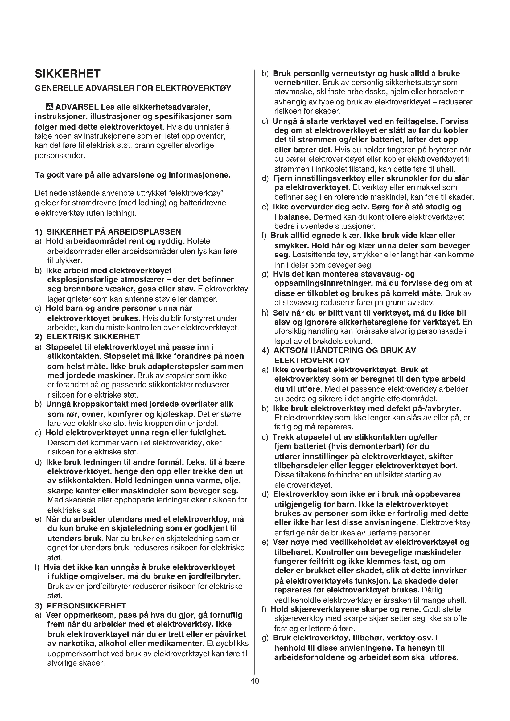 ELEKTROVERKTØY a) Ikke overbelast elektroverktøyet. Bruk et elektroverktøy som er beregnet til den type arbeid du vil utføre. Med et passende elektroverktøy arbeider du bedre og sikrere i det angitte eektområdet. b) Ikke bruk elektroverktøy med defekt på-/avbryter. Et elektroverktøy som ikke lenger kan slås av eller på, er farlig og må repareres. c) Trekk støpselet ut av stikkontakten og/eller fjern batteriet (hvis demonterbart) før du utfører innstillinger på elektroverktøyet, skifter tilbehørsdeler eller legger elektroverktøyet bort. Disse tiltakene forhindrer en utilsiktet starting av elektroverktøyet. d) Elektroverktøy som ikke er i bruk må oppbevares utilgjengelig for barn. Ikke la elektroverktøyet brukes av personer som ikke er fortrolig med dette eller ikke har lest disse anvisningene. Elektroverktøy er farlige når de brukes av uerfarne personer. e) Vær nøye med vedlikeholdet av elektroverktøyet og tilbehøret. Kontroller om bevegelige maskindeler fungerer feilfritt og ikke klemmes fast, og om deler er brukket eller skadet, slik at dette innvirker på elektroverktøyets funksjon. La skadede deler repareres før elektroverktøyet brukes. Dårlig vedlikeholdte elektroverktøy er årsaken til mange uhell. f) Hold skjæreverktøyene skarpe og rene. Godt stelte skjæreverktøy med skarpe skjær setter seg ikke så ofte fast og er lettere å føre. g) Bruk elektroverktøy, tilbehør, verktøy osv. i henhold til disse anvisningene. Ta hensyn til arbeidsforholdene og arbeidet som skal utføres. SIKKERHET