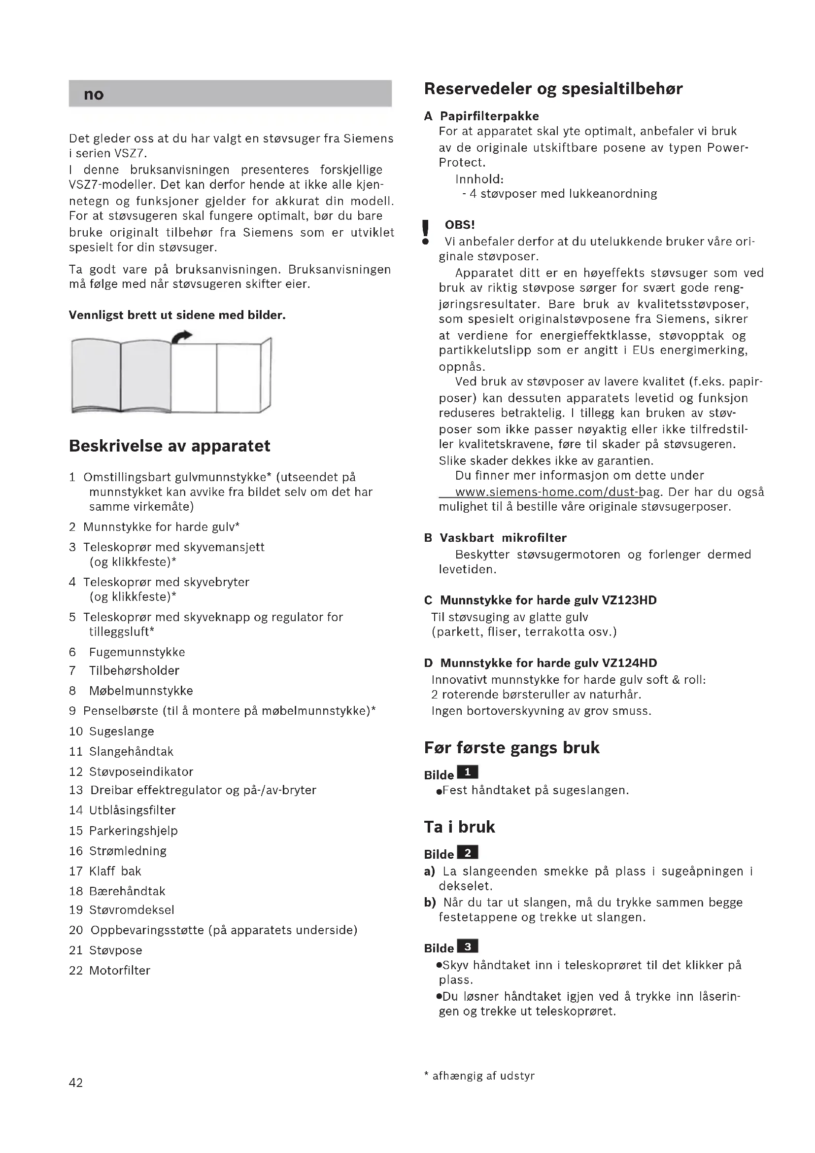 - afhængig af udstyr Det gleder oss at du har valgt en støvsuger fra Siemens i serien VSZ7. I denne bruksanvisningen presenteres forskjellige VSZ7-modeller. Det kan derfor hende at ikke alle kjen- netegn og funksjoner gjelder for akkurat din modell. For at støvsugeren skal fungere optimalt, bør du bare bruke originalt tilbehør fra Siemens som er utviklet spesielt for din støvsuger. Ta godt vare på bruksanvisningen. Bruksanvisningen må følge med når støvsugeren skifter eier. Vennligst brett ut sidene med bilder. Beskrivelse av apparatet 1 Omstillingsbart gulvmunnstykke* (utseendet på munnstykket kan avvike fra bildet selv om det har samme virkemåte) 2 Munnstykke for harde gulv* 3 Teleskoprør med skyvemansjett (og klikkfeste)* 4 Teleskoprør med skyvebryter (og klikkfeste)* 5 Teleskoprør med skyveknapp og regulator for tilleggsluft* 6 Fugemunnstykke 7 Tilbehørsholder 8 Møbelmunnstykke 9 Penselbørste (til å montere på møbelmunnstykke)* 10 Sugeslange 11 Slangehåndtak 12 Støvposeindikator 13 Dreibar effektregulator og på-/av-bryter 14 Utblåsingsfilter 15 Parkeringshjelp 16 Strømledning 17 Klaff bak 18 Bærehåndtak 19 Støvromdeksel 20 Oppbevaringsstøtte (på apparatets underside) 21 Støvpose 22 Motorfilter